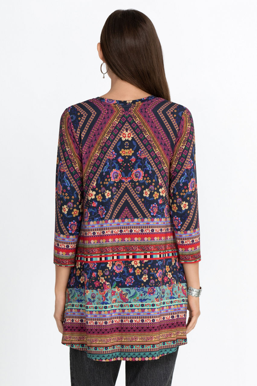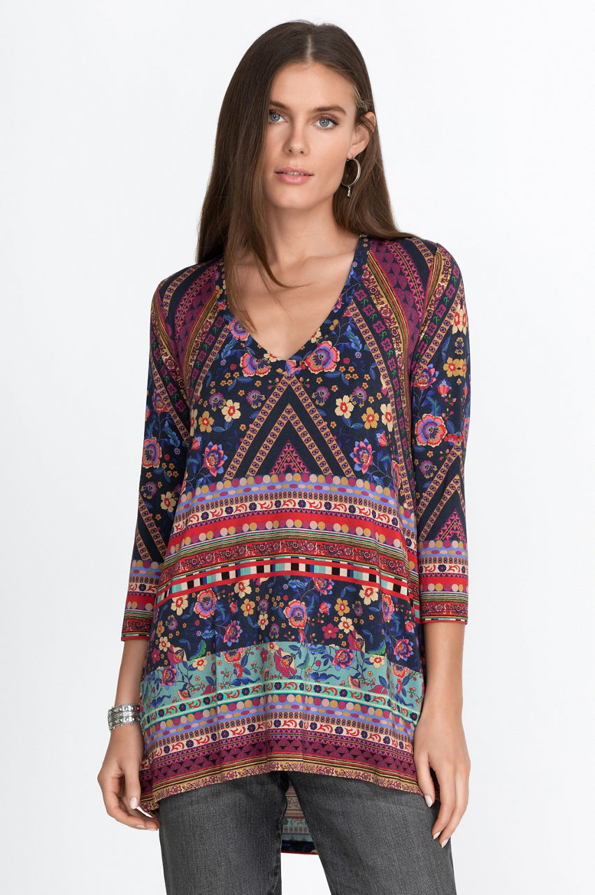 This flowy tunic creates a flattering silhouette with its loose fit. The classic V-neck creates a casual look, while the elegant print introduces some color to your outfits. This elegant tunic will quickly become a staple of your wardrobe thanks to its versatile style. Add a scarf that matches the print of the tunic, and opt for some neutral leggings for a stylish result.