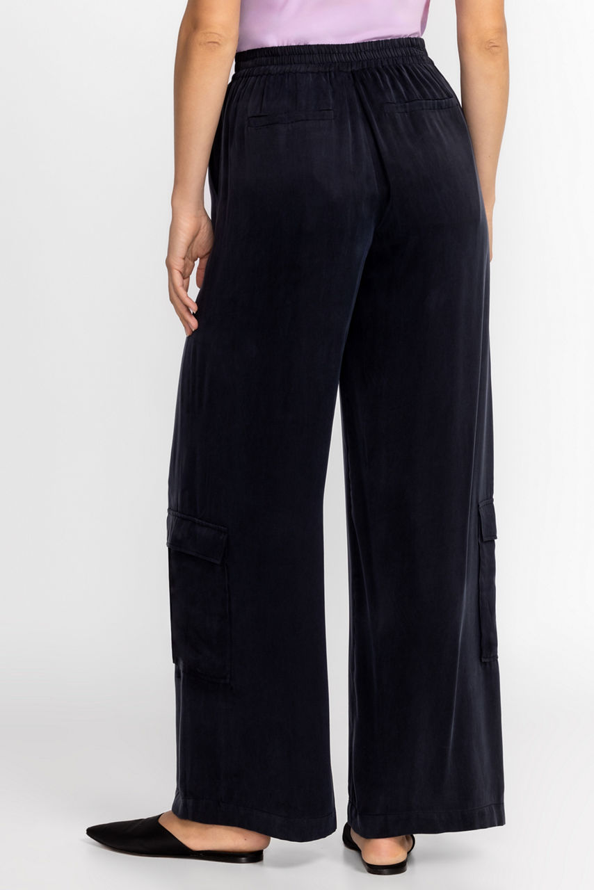 Offering an elevated take on classic cargo pants, the Cupro Pleated Pull On Pants are crafted from a lightweight flowing fabric. Featuring an elastic waist with a button-front closure, these wide leg pants are finished with pockets at the front and back and cargo pockets at the leg line. Pair with a fitted top and trendy sneakers for a modern casual look.