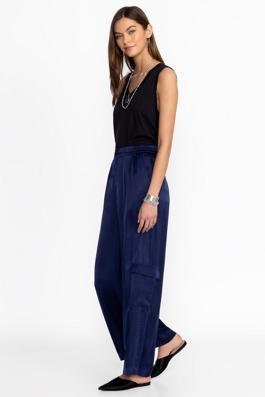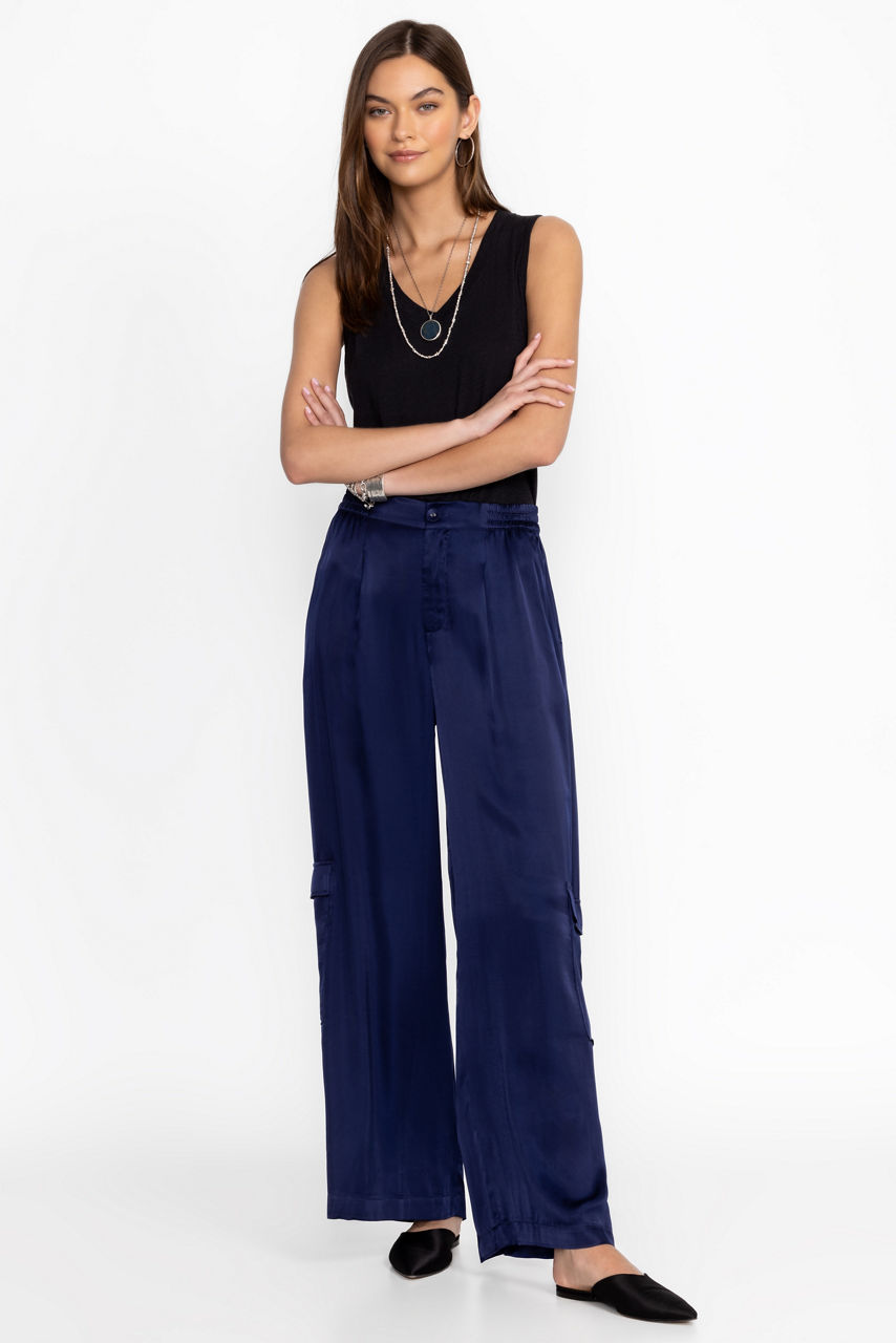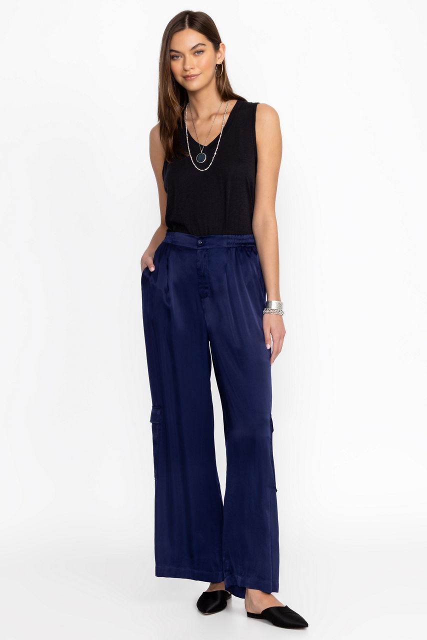 Crafted from a lightweight flowing fabric, the Cupro Pleated Pull On Pants add a stylish flare to a classic wide leg. Featuring an elastic waist and pleated detailing at the front, these wide-leg pants are finished with slant packets and cargo pockets for a unique twist. Pair with a fitted tank and sandals for a polished casual look.