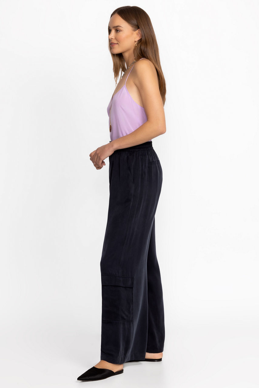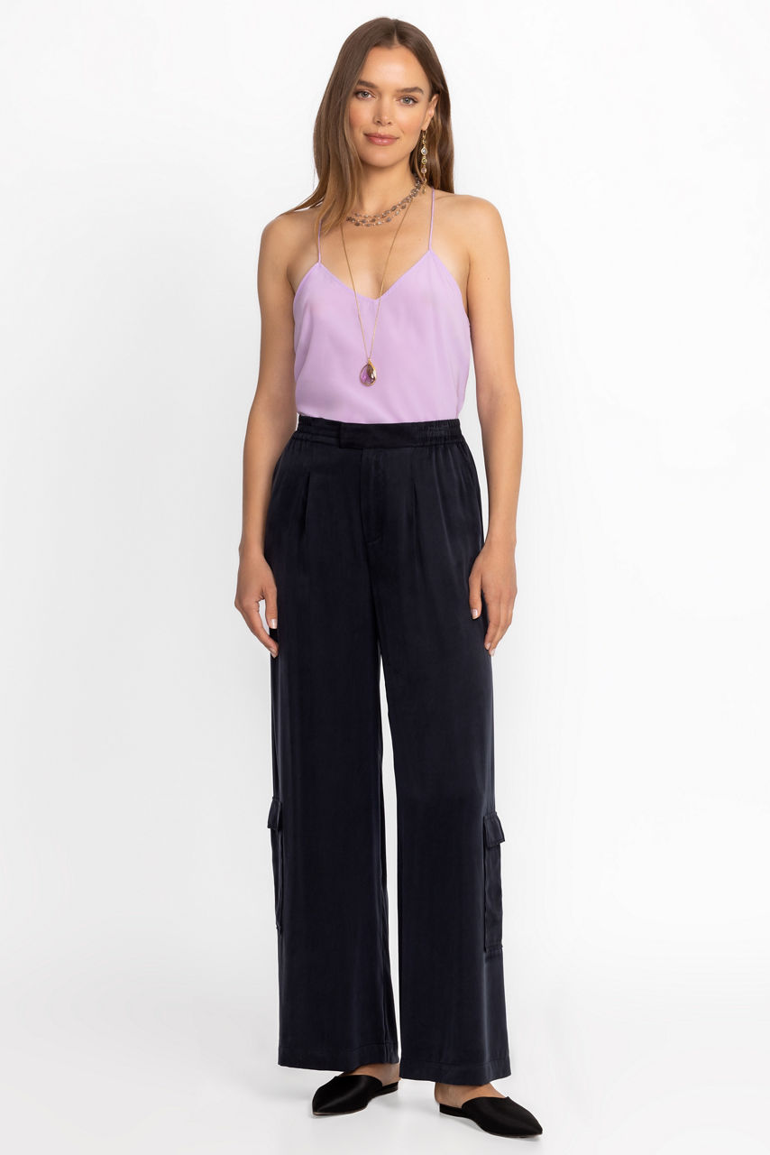 Offering an elevated take on classic cargo pants, the Cupro Pleated Pull On Pants are crafted from a lightweight flowing fabric. Featuring an elastic waist with a button-front closure, these wide leg pants are finished with pockets at the front and back and cargo pockets at the leg line. Pair with a fitted top and trendy sneakers for a modern casual look.