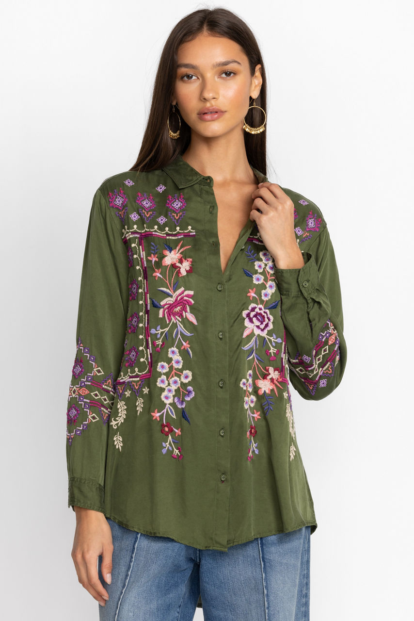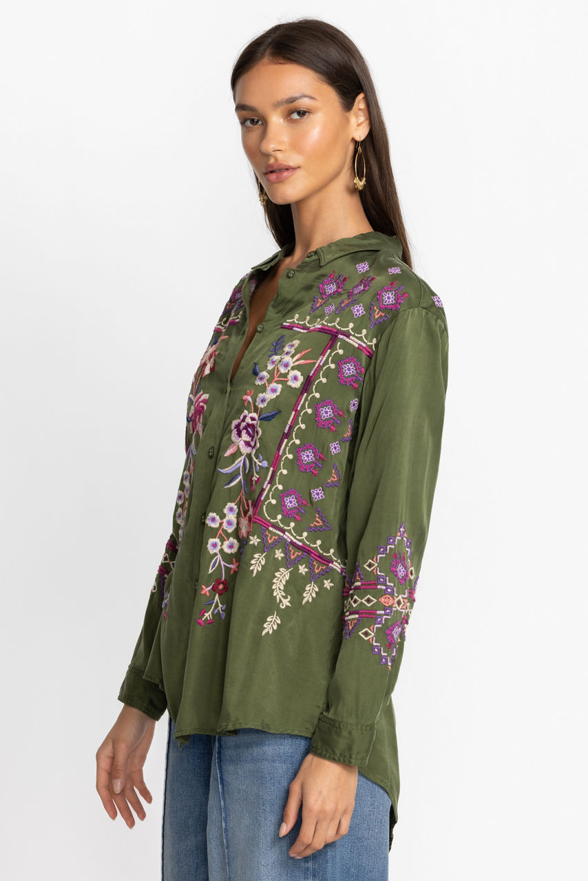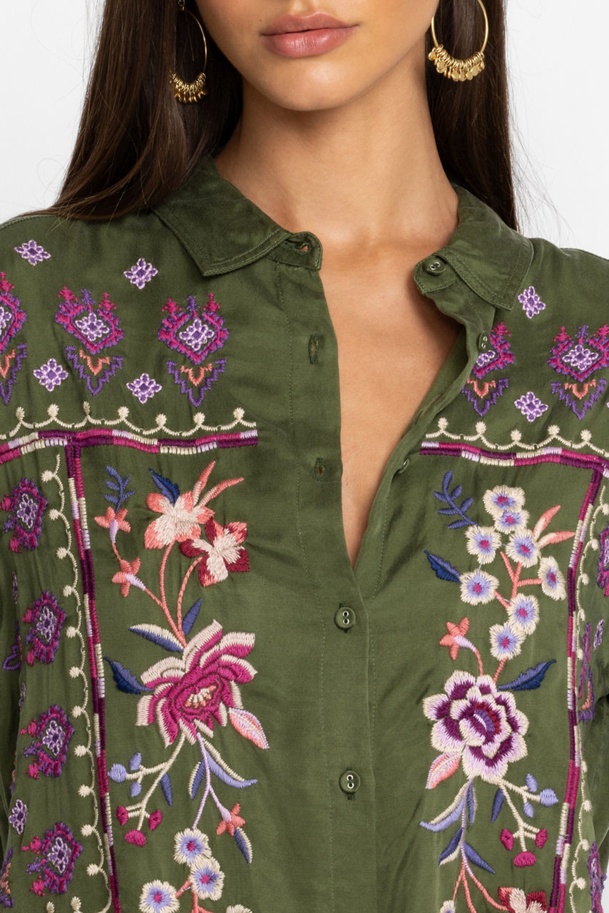 Designed from a breathable material, this Curacao Oversized Shirt Tunic delights with its freshly picked florals. Cut for a comfortable oversized fit, this shirt tunic features a collar, a front button closure, long sleeves, a pleated back, and a colorful floral placement embroidery. Wear your shirt tunic with beige linen or modernize the look with dark denim.