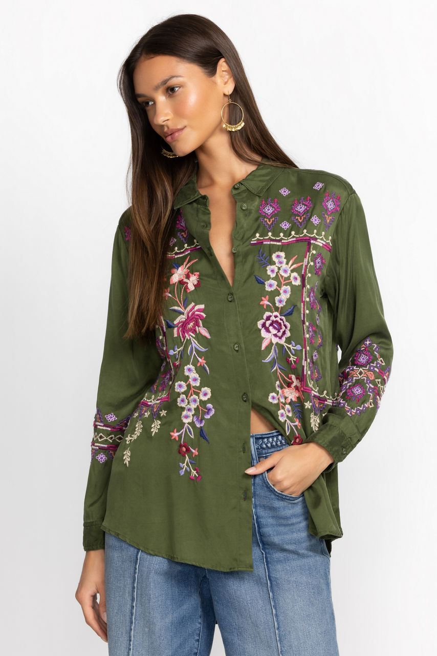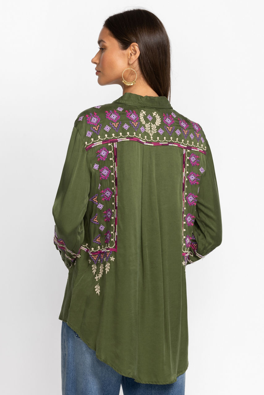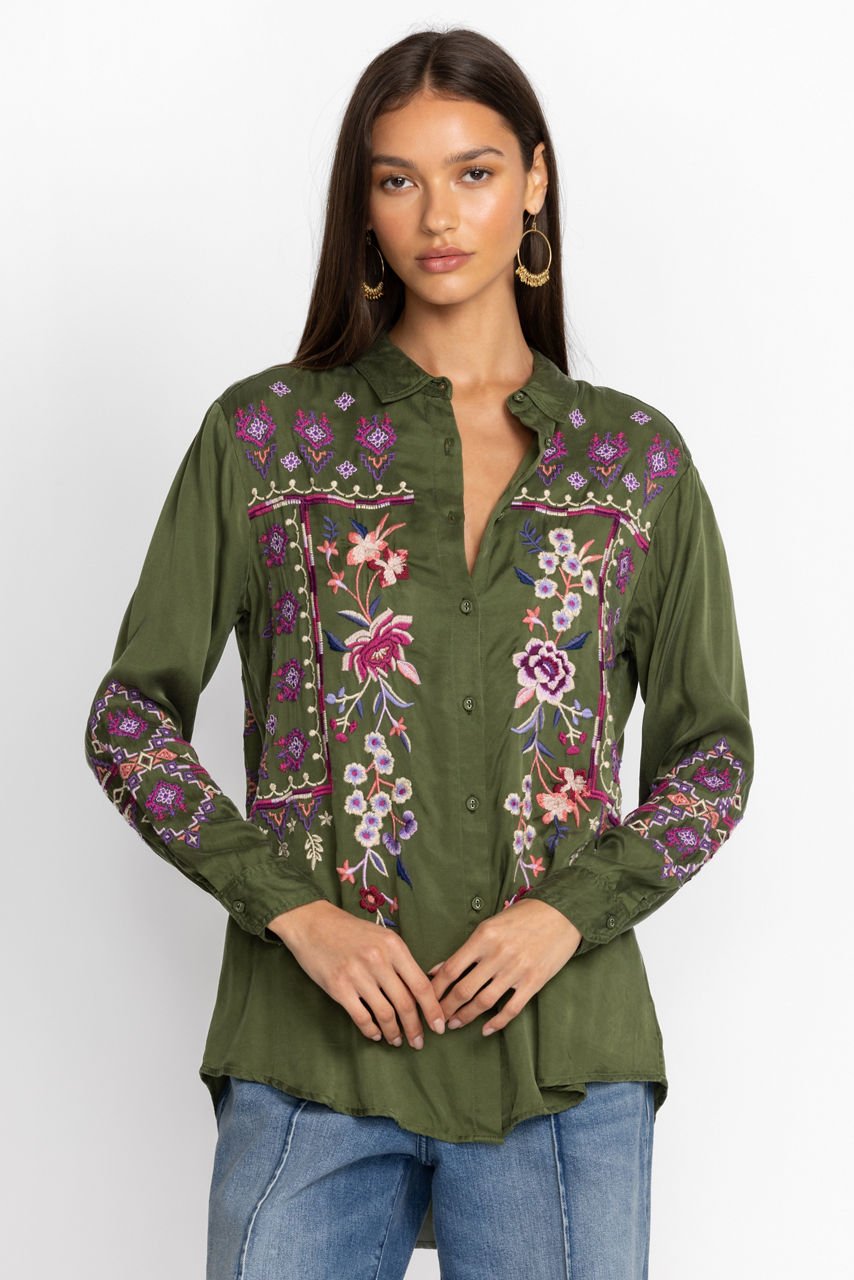 Designed from a breathable material, this Curacao Oversized Shirt Tunic delights with its freshly picked florals. Cut for a comfortable oversized fit, this shirt tunic features a collar, a front button closure, long sleeves, a pleated back, and a colorful floral placement embroidery. Wear your shirt tunic with beige linen or modernize the look with dark denim.