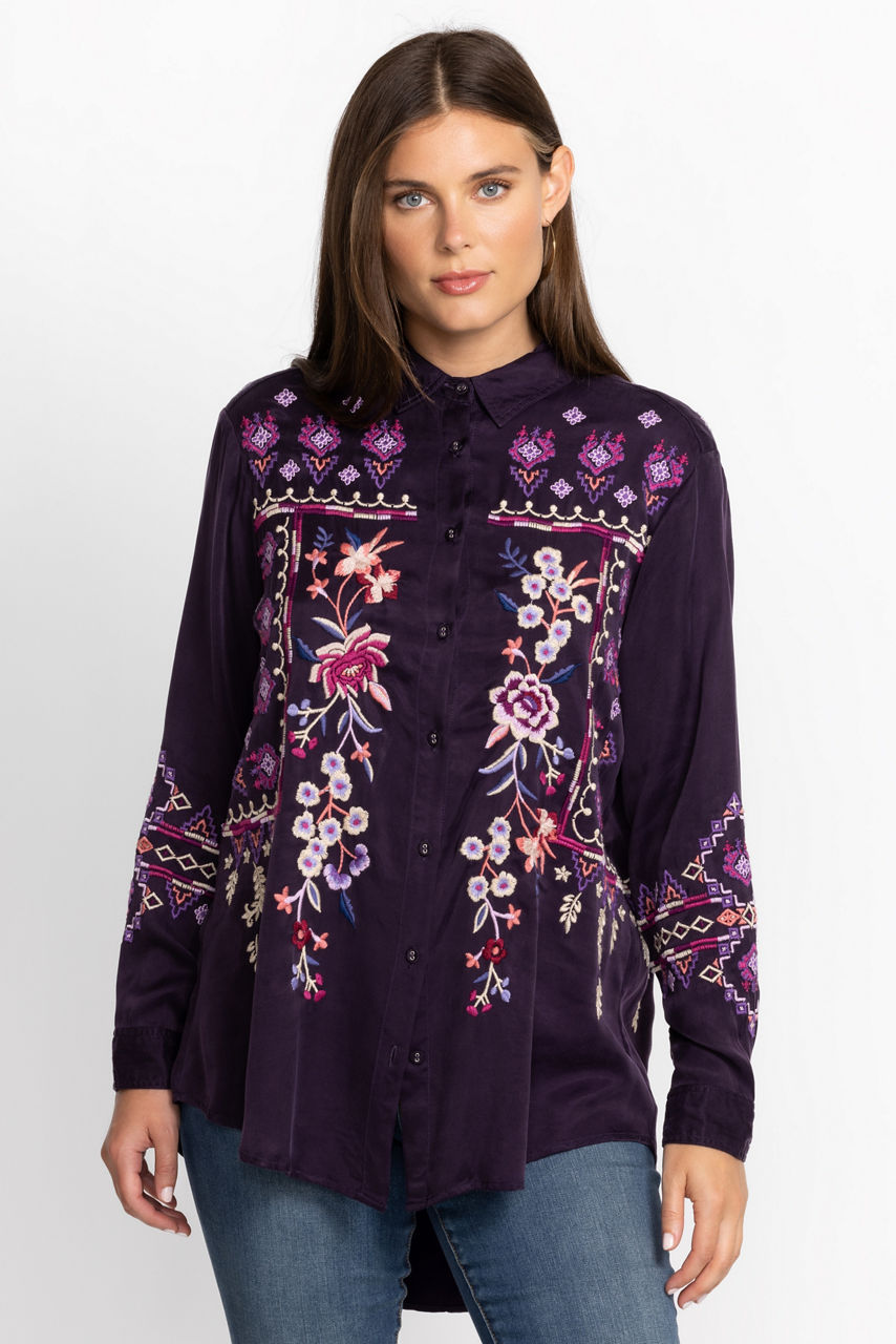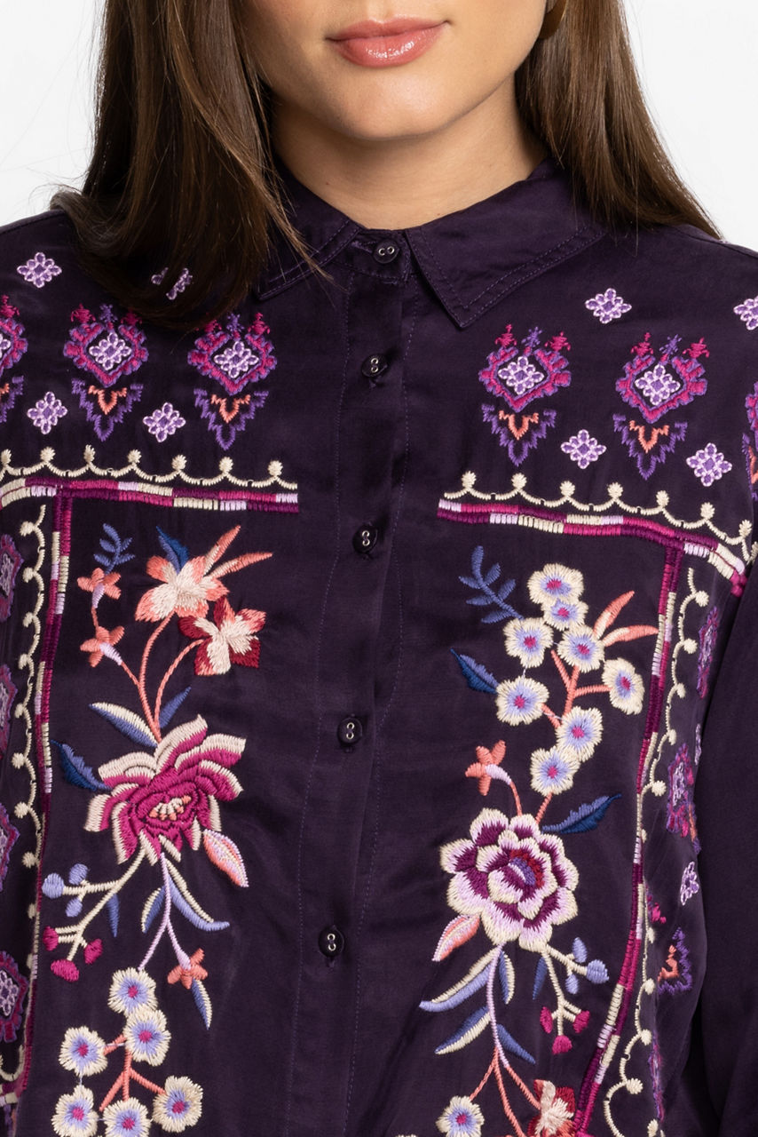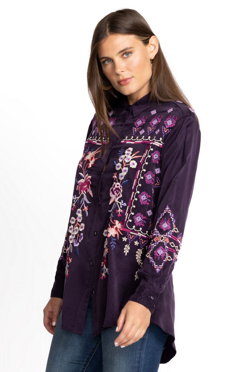 Designed from a breathable material, this Curacao Oversized Shirt Tunic delights with its freshly picked florals. Cut for a comfortable oversized fit, this shirt tunic features a collar, a front button closure, long sleeves, a pleated back, and a colorful floral placement embroidery. Wear your shirt tunic with beige linen or modernize the look with dark denim.