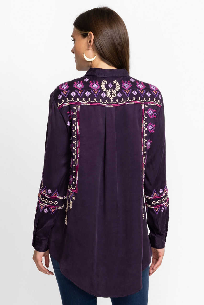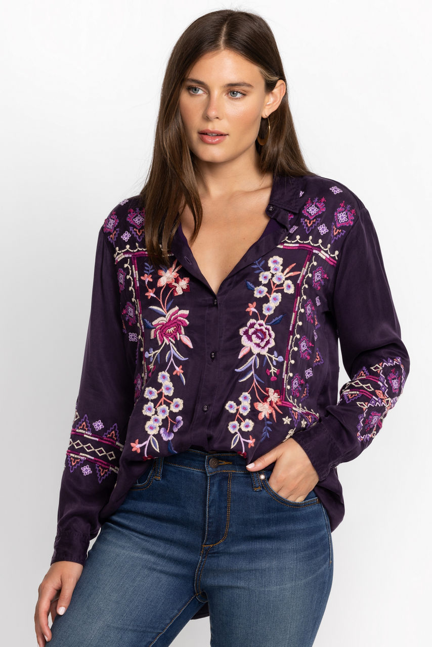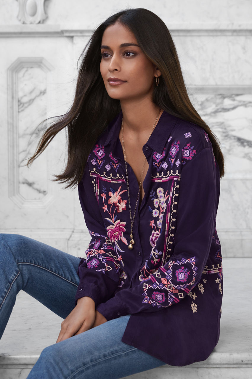Designed from a breathable material, this Curacao Oversized Shirt Tunic delights with its freshly picked florals. Cut for a comfortable oversized fit, this shirt tunic features a collar, a front button closure, long sleeves, a pleated back, and a colorful floral placement embroidery. Wear your shirt tunic with beige linen or modernize the look with dark denim.