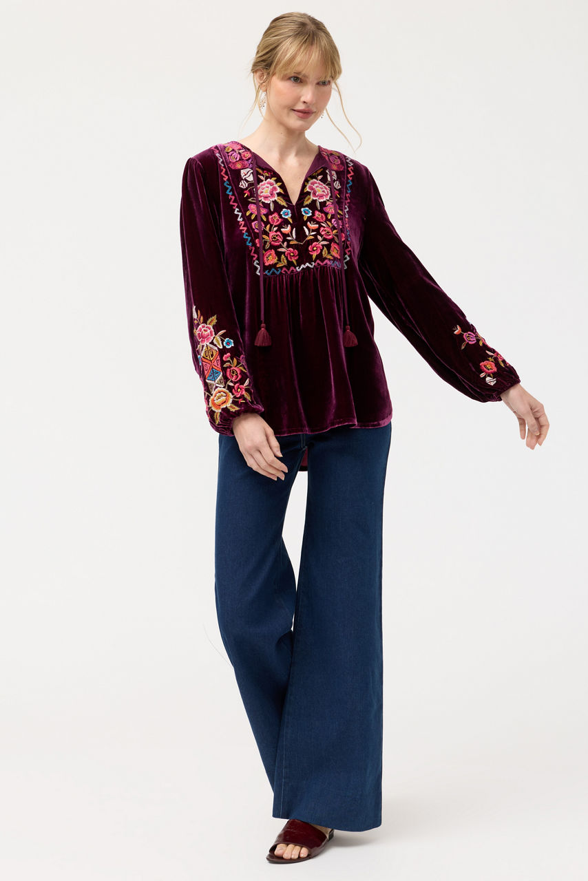 Crafted from a unique silk blend, the Anaya Curved Hem Prairie Blouse is embellished with brilliant, embroidered florals. Featuring a split V-neckline with tassels, this vibrant top offers a colorful yoke with gathers at the edges and is finished with billowing Bishop sleeves. Pair with denim trousers and wedge heels for a casual night out with friends.