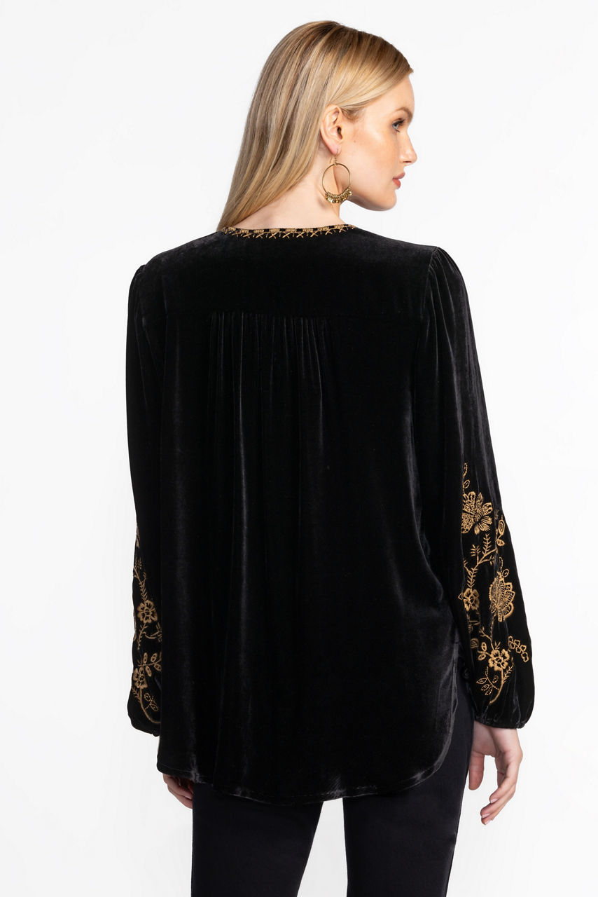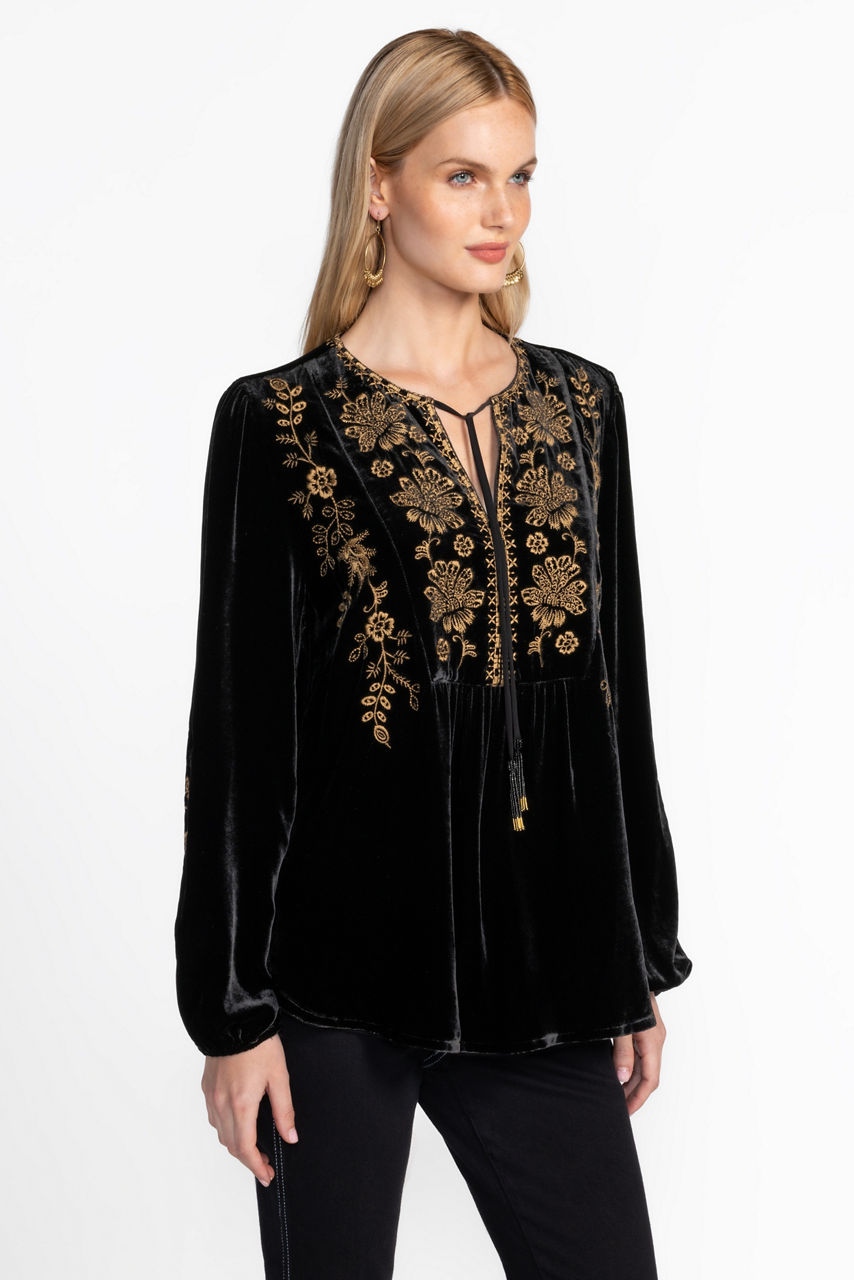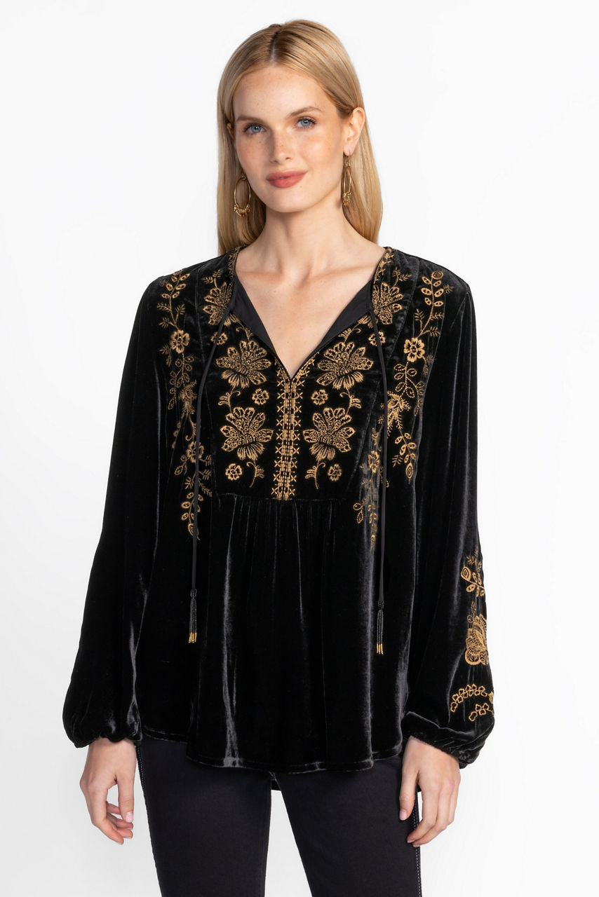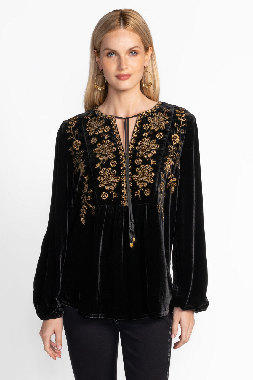 Crafted from a stunning deep red silk blend, the Curved Hem Prairie Blouse is equal parts elegance and comfort. Featuring a split V-neckline and billowing bishop sleeves, this beautiful blouse is carefully detailed with intricate embroidery, beaded tassels and gathers at the front and back. Pair with fitted pants and strappy heels for a fresh evening look.