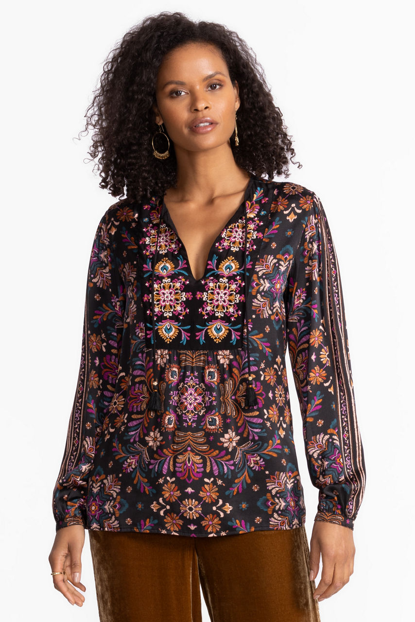 Crafted from a luxurious silk blend, the Curved Hem Prairie Blouse, is adorned with a kaleidoscope of brilliant color and pattern. Designed with a split V-and long sleeves, this colorful blouse is finished with a curved hemline and vibrant embroidered accents. Pair with flowing silk trousers and polished flats for an evening out with friends.