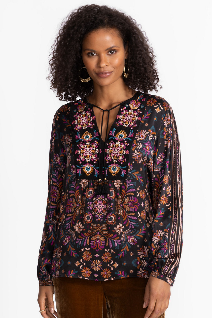 Crafted from a luxurious silk blend, the Curved Hem Prairie Blouse, is adorned with a kaleidoscope of brilliant color and pattern. Designed with a split V-and long sleeves, this colorful blouse is finished with a curved hemline and vibrant embroidered accents. Pair with flowing silk trousers and polished flats for an evening out with friends.