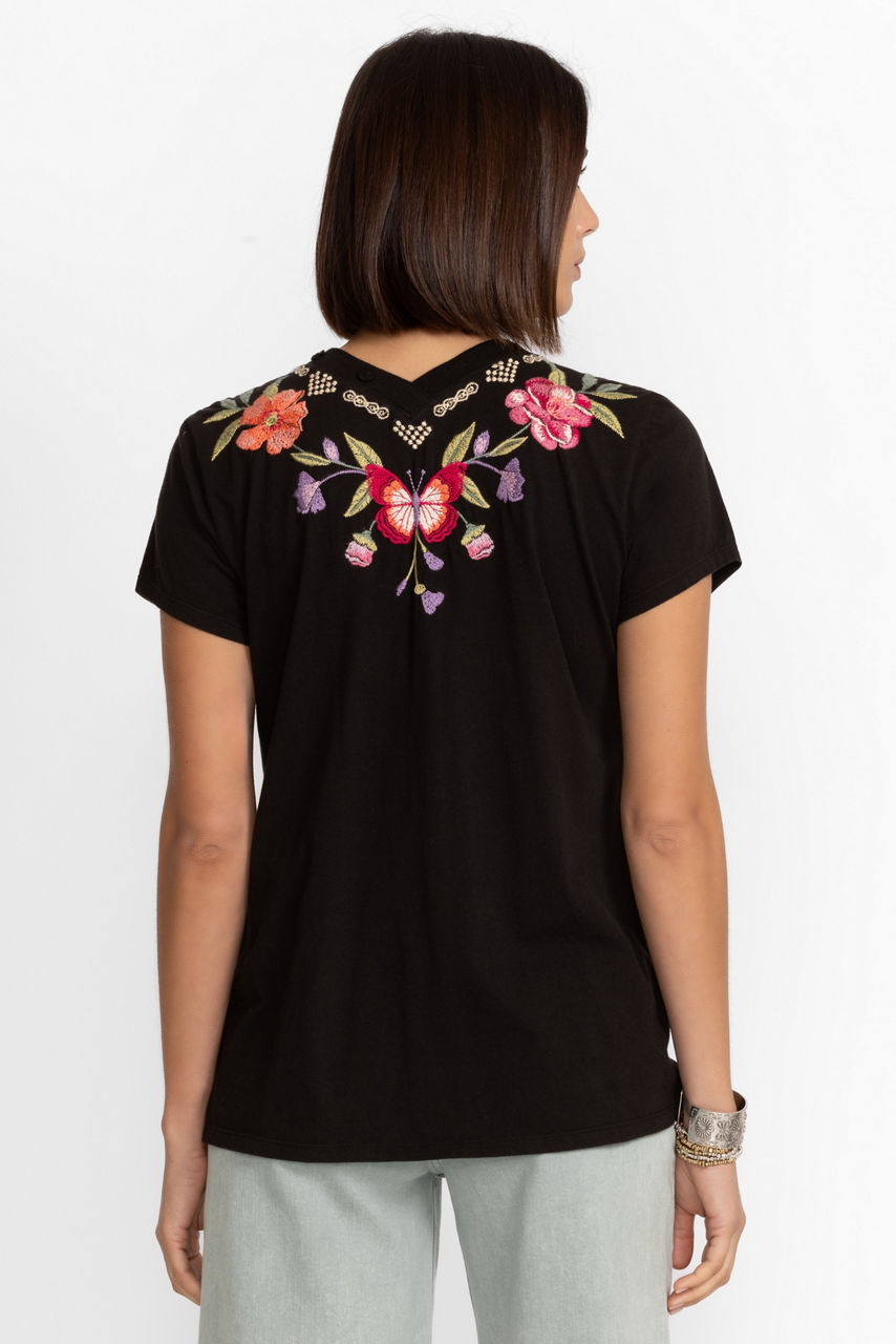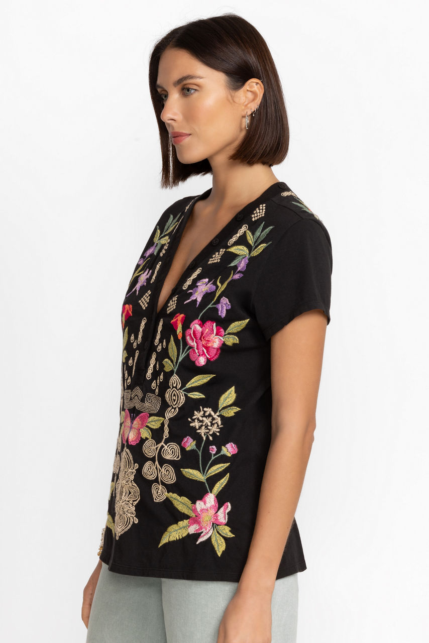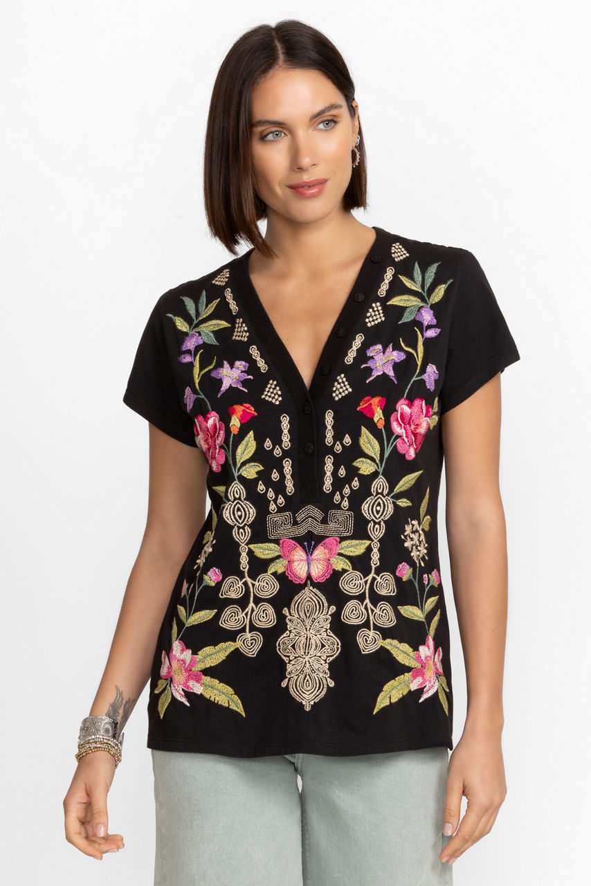 Elevate your casual tee collection with the bold color and pattern of the Button Neck Knit Tee. Crafted from 100% cotton this tee is embellished with vibrant placement embroidery and features a split V-neckline with buttons and short sleeves. Pair with solid color shorts and easy sandals for a colorful casual look.