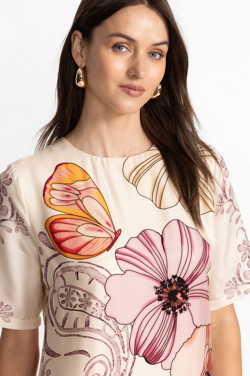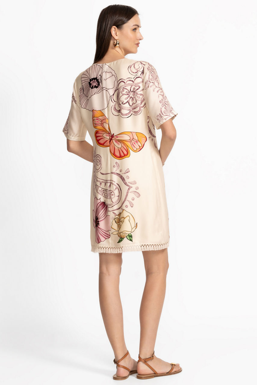 Adorned with bold floral images and butterflies in flight, the Daisee Fringe Mini Dress is crafted from a unique silk blend. Designed with a rounded neckline short sleeves, this dress offers a zip back closure and is finished with intricate fringe detailing at the hemline. Pair with coordinating kitten heels and delicate jewelry for a polished daytime event.