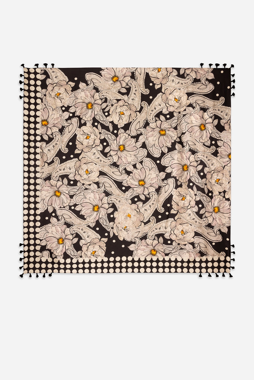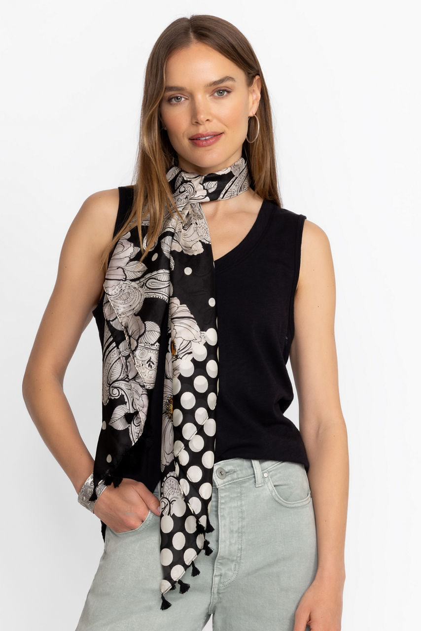 Crafted from 100% silk, the Daisy Silk Scarf adds a touch of whimsy to any look. Featuring a variety of brilliant floral patterns against a rich black backdrop, this bold scarf is finished with decorative tassels at the corners. Add to a traditional work look for a bold pop of color.