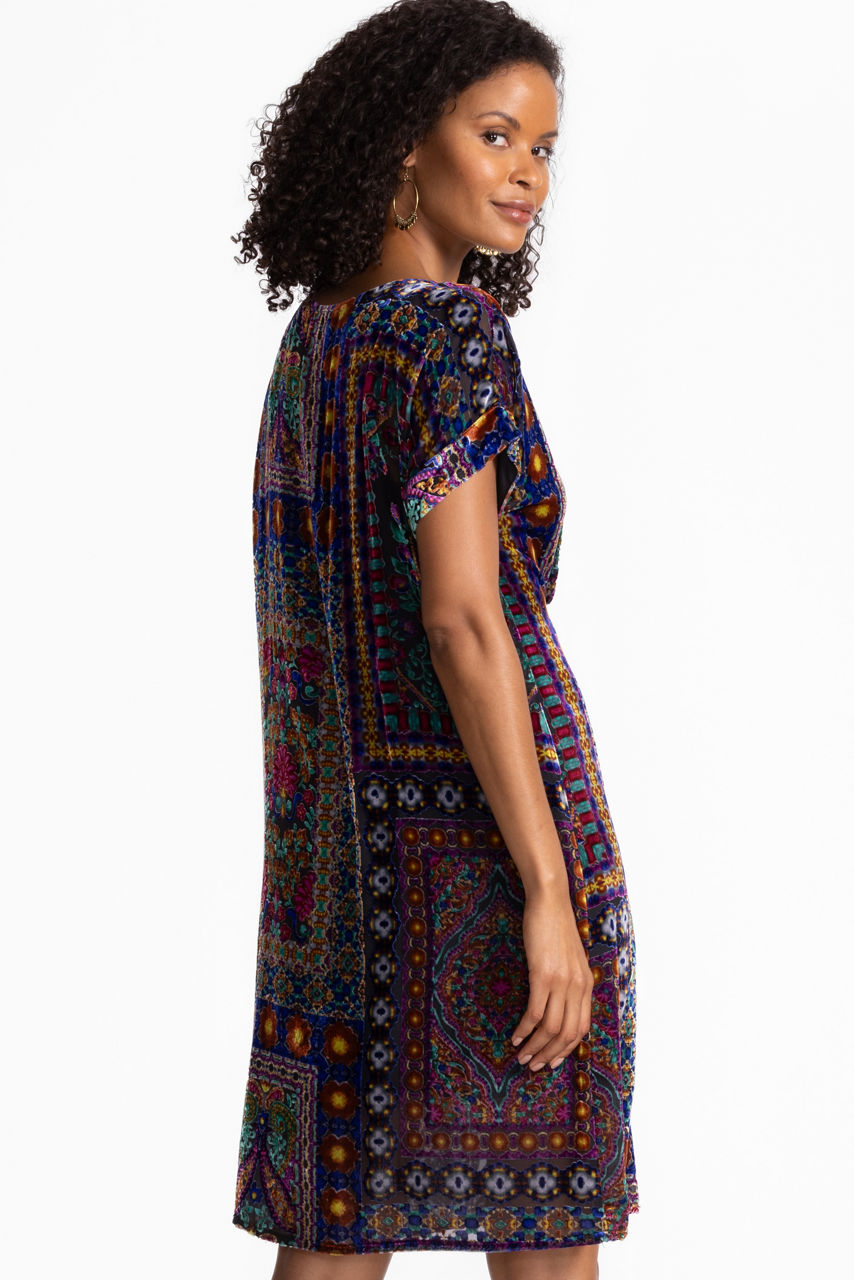 Crafted from a unique silk blend, the Sophia Burnout Daiyu Dress is embellished with a bold patchwork pattern in vibrant color. Featuring a curved neckline and short Dolman sleeves, this slip-lined dress is finished with a straight silhouette. Pair with colorful flats and delicate jewelry for a night out with friends.