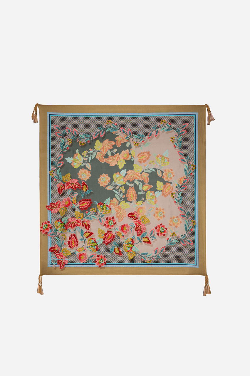 The beautiful red and mint floral motif stand out against the grey background of our Dance Mint Scarf. It is sure to complete any look. Add a pop of color to your favorite leather bag by tying it onto the strap, or drape it around your neck to add finishing touches to your favorite t-shirt and jeans.