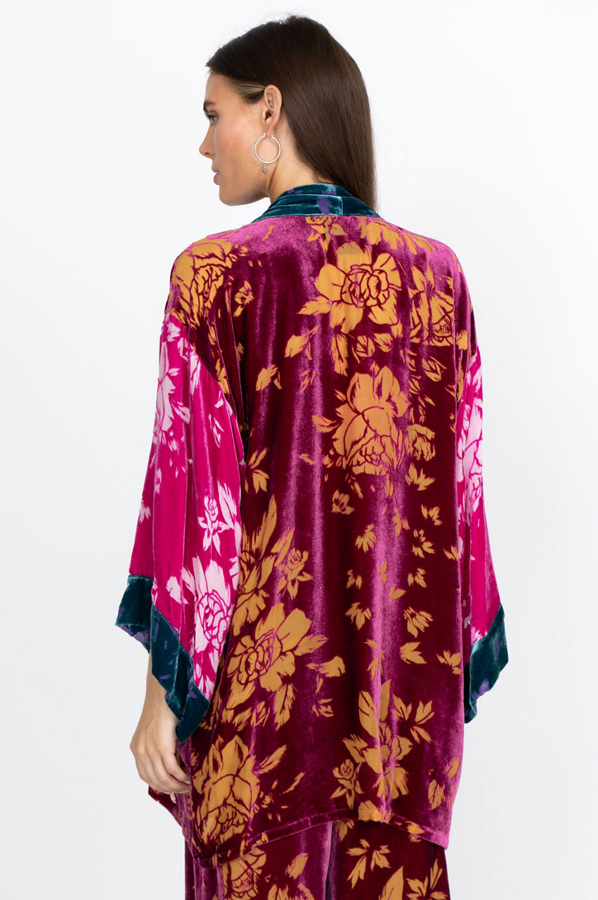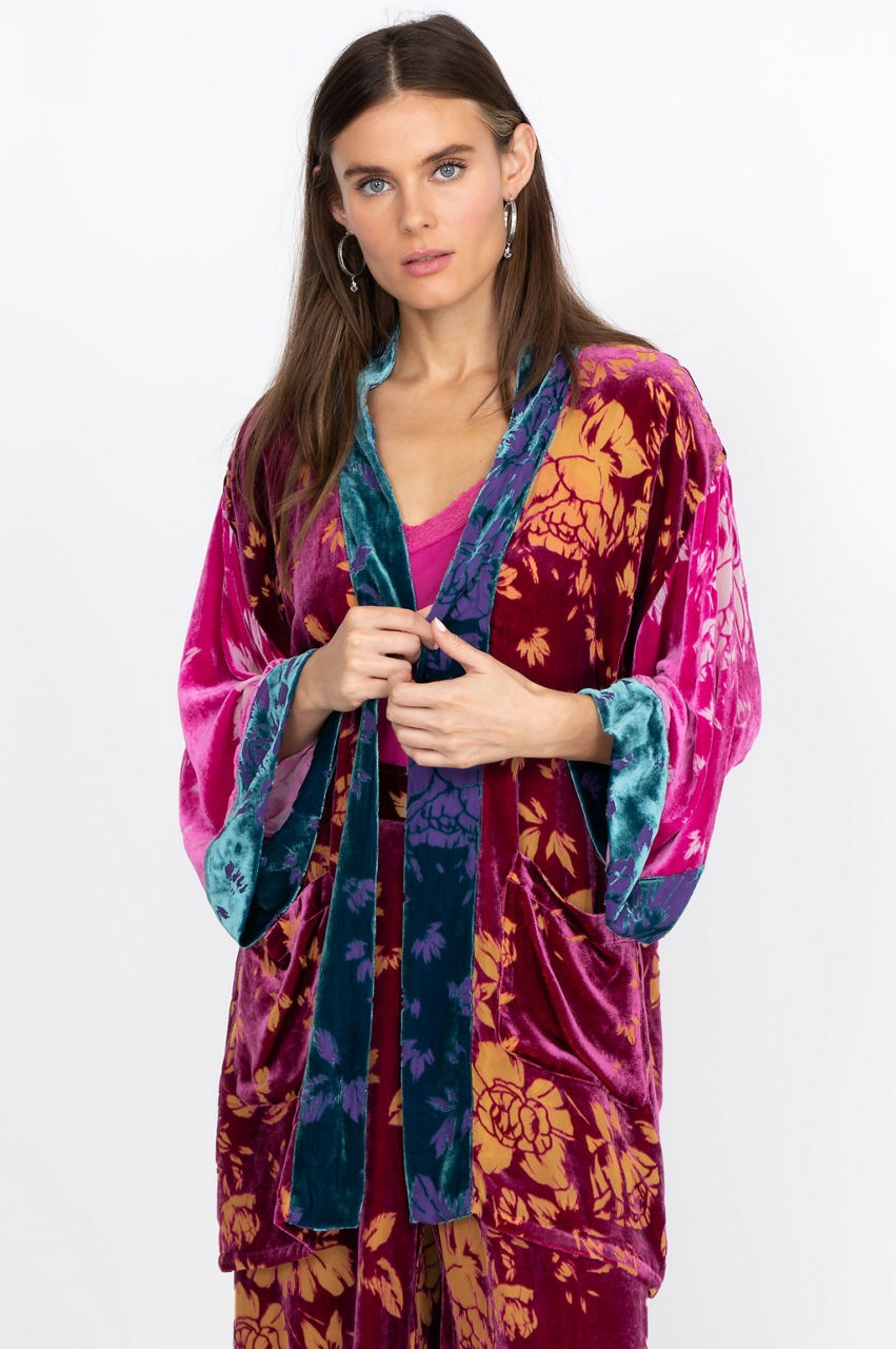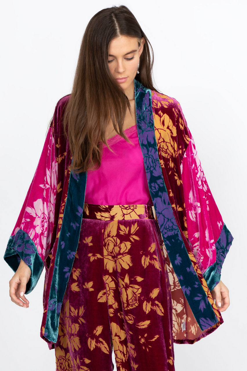 Made with a deliciously extravagant print, the Dancing Queen Kimono is a staple for effortless elegance. This kimono has convenient pockets, making it easy to wear at home or out and about. Dress up the kimono by pairing it with fitted jeans and a simple tee. Accessorize with minimalistic gold or silver jewelry to allow the kimono to shine.