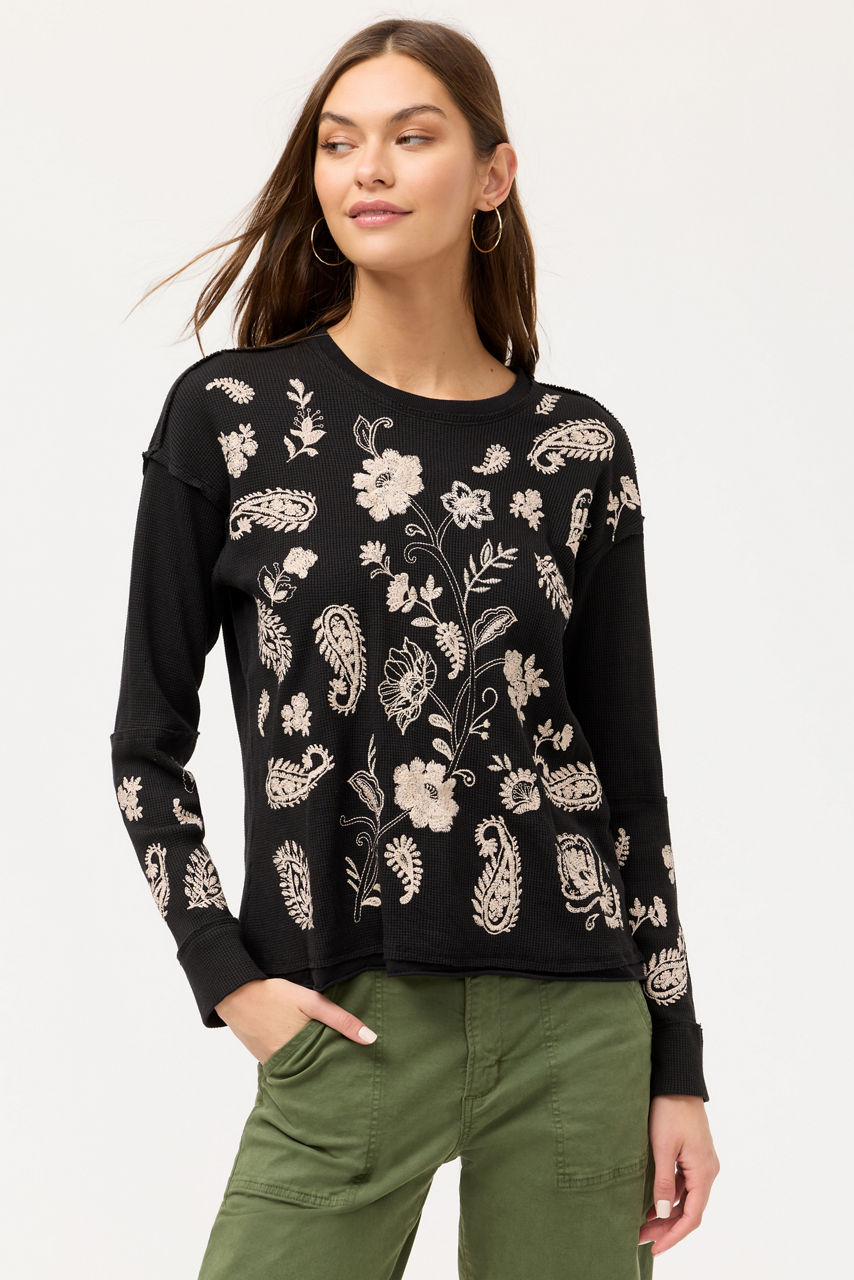 Crafted from a breathable cotton blend, the Daniela Patchwork Thermal is equal parts casual and elevated. Featuring a crew neckline and long sleeves, this easy thermal top is finished with intricately embroidered floral detailing for a distinctly feminine feel. Pair with relaxed-fit jeans and fashion sneakers for a casual weekend ensemble.