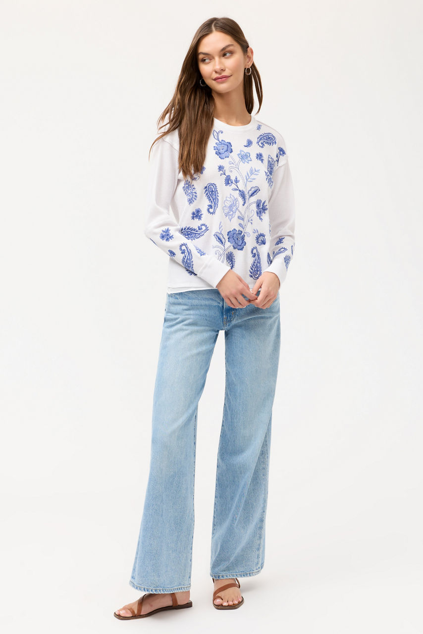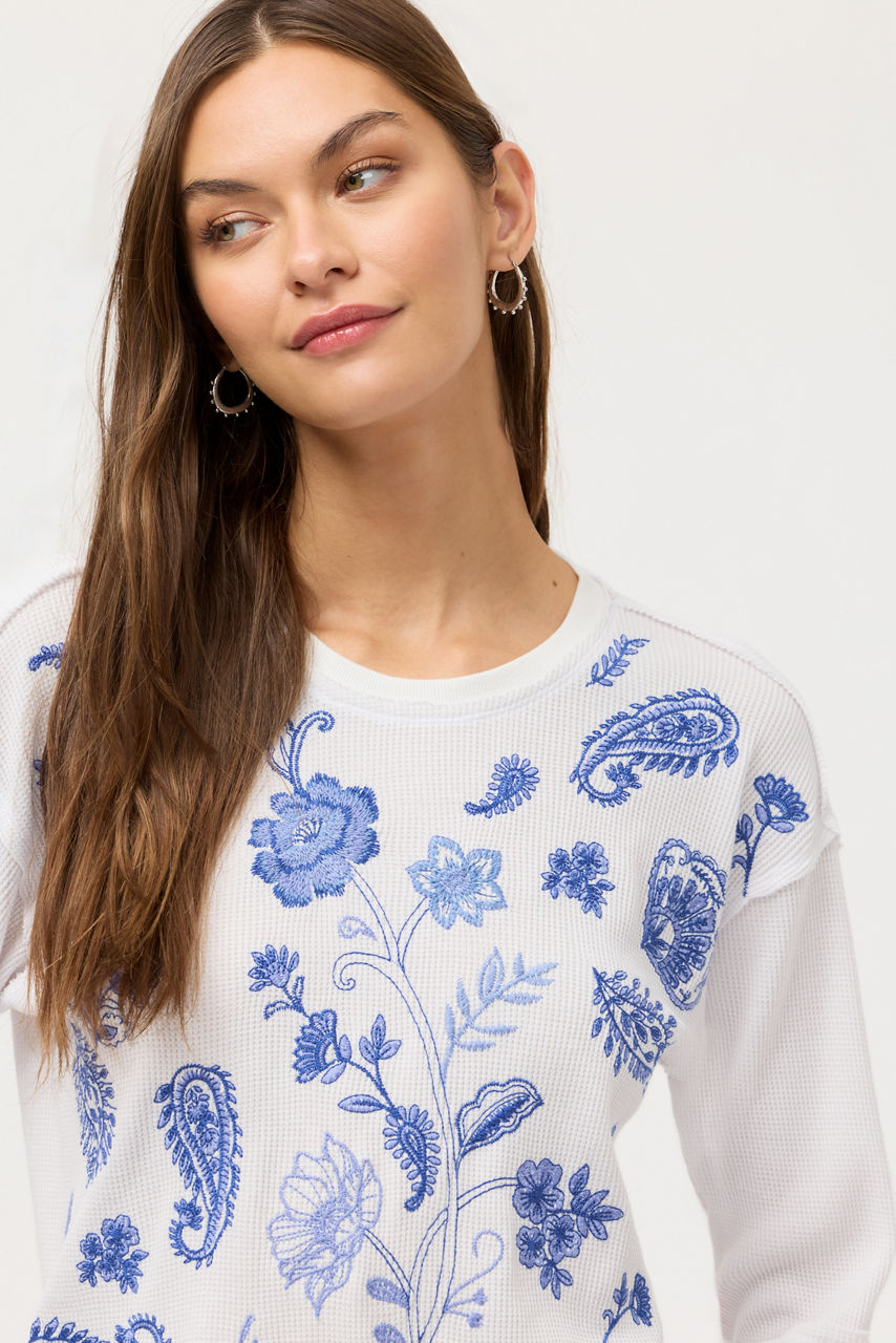 Crafted from a breathable cotton blend, the Daniela Patchwork Thermal is equal parts casual and elevated. Featuring a crew neckline and long sleeves, this easy thermal top is finished with intricately embroidered floral detailing for a distinctly feminine feel. Pair with relaxed-fit jeans and fashion sneakers for a casual weekend ensemble.