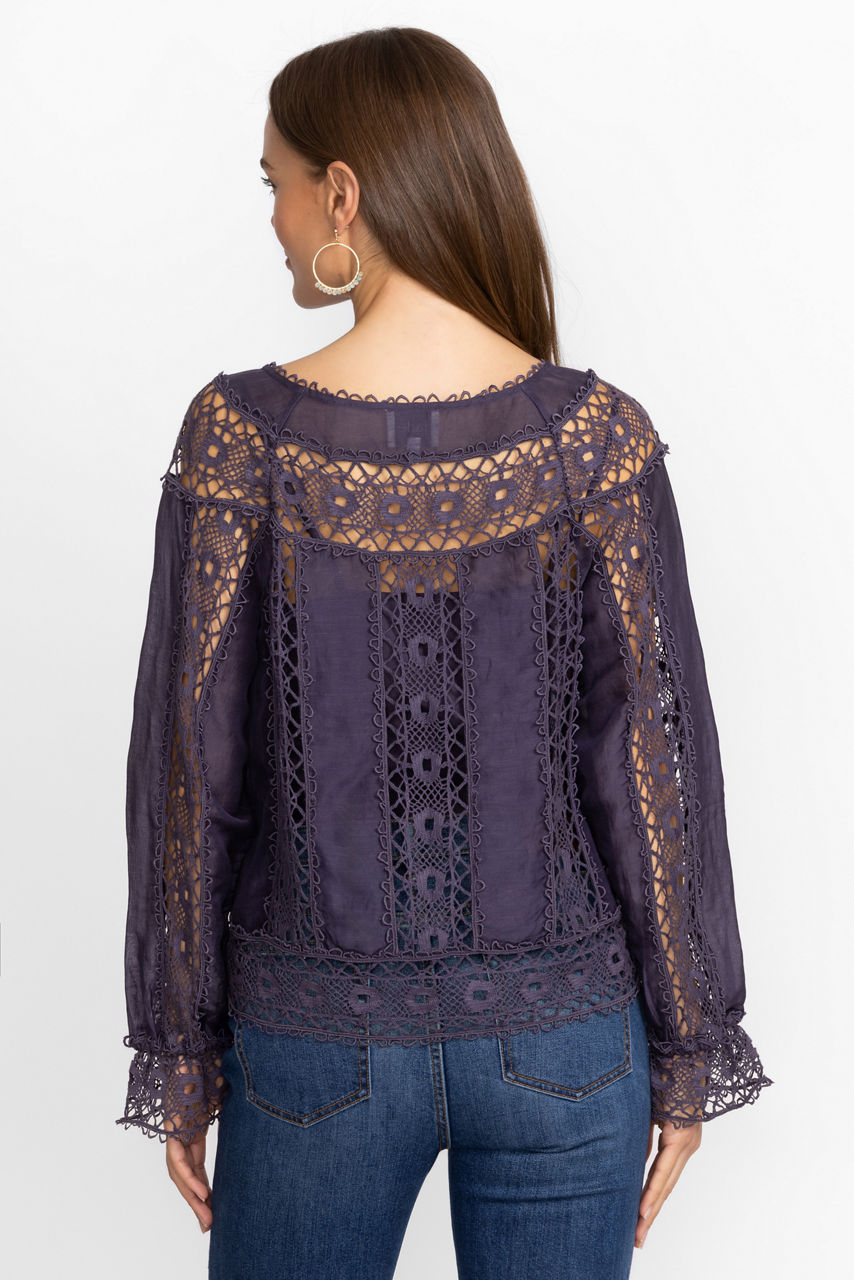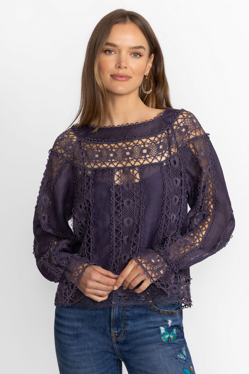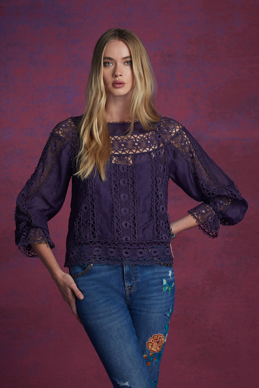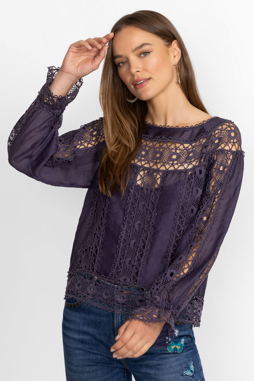 Crafted from a breathable linen blend with a hint of stretch, the Danila Lace Blouse offers intricate feminine detailing. Featuring a boatneck and relaxed raglan sleeves with elastic cuffs, this slip-lined blouse is embellished with carefully placed lace cutouts. Pair with a rich color skirt and wedge heels for a date night ensemble.