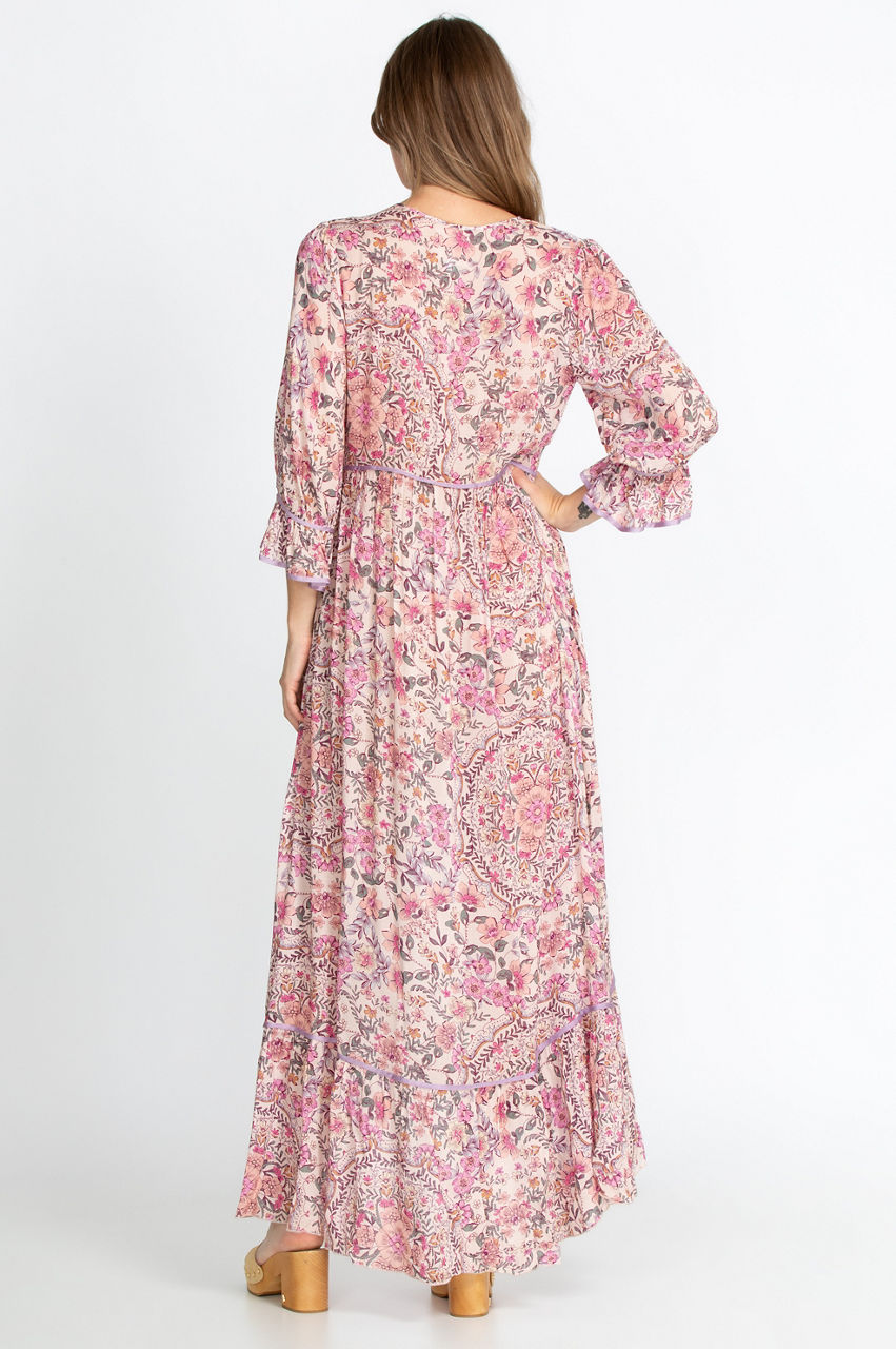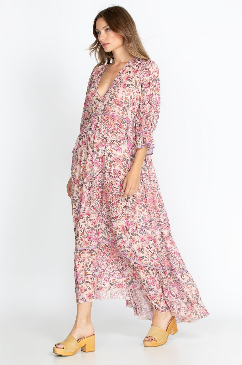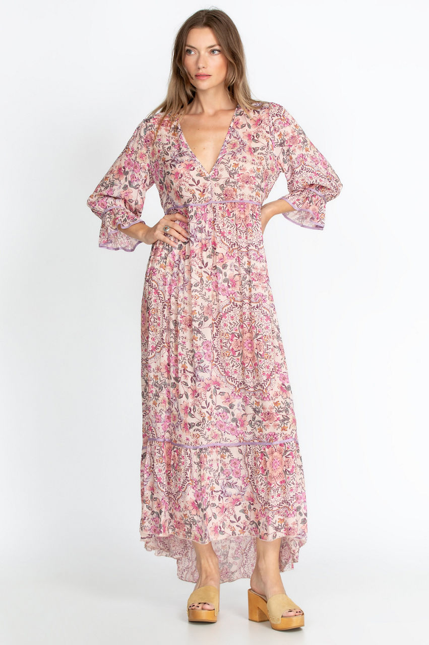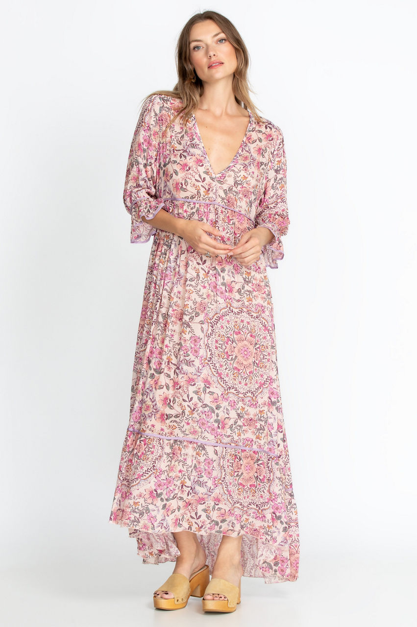 Upgrade your summertime wardrobe with this chic and delicate maxi dress. Details like the mid-length poet sleeves and waist elevate the gorgeous chintz-inspired floral print and turn this dress into a sophisticated piece. Let the V-neck and sleeve detail draw attention to your favorite pendant or bangles, and complete this vintage look with some cork sandals and a retro handbag.