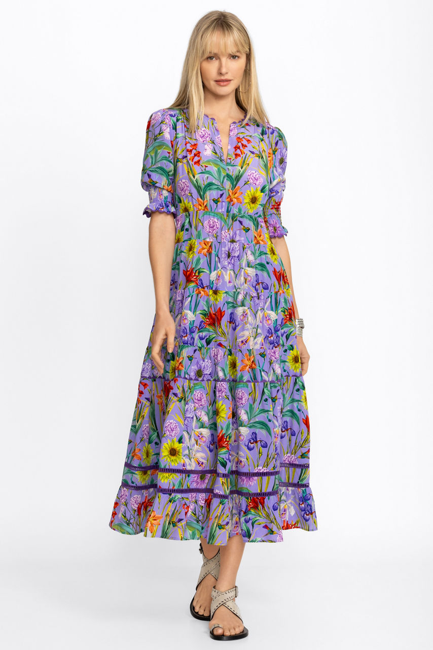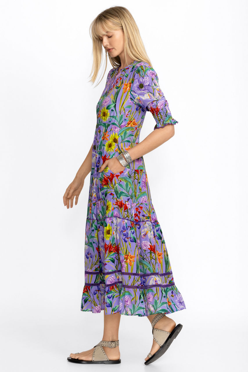 Crafted from 100% Silk, the Daphne Silk Maxi Dress is bursting with bold color and fresh floral patterns. Featuring a split neckline and unique smocking at the sleeves, this dress offers a fitted elastic waist leading to a tiered maxi skirt with intricate detailing. Pair with bold flats and a wide brim hat for a classic resort look.