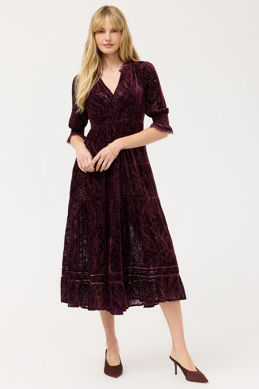 Crafted from a unique silk blend, the Daphne Tea Length Dress is embellished with a rich paisley burnout pattern. Featuring a split V-neckline and shirred puff sleeves with lace trim, this slip-lined dress is finished with a tiered skirt and a rail trim. Pair with classic pumps and a coordinating bag for a fresh evening look perfect for a night out.