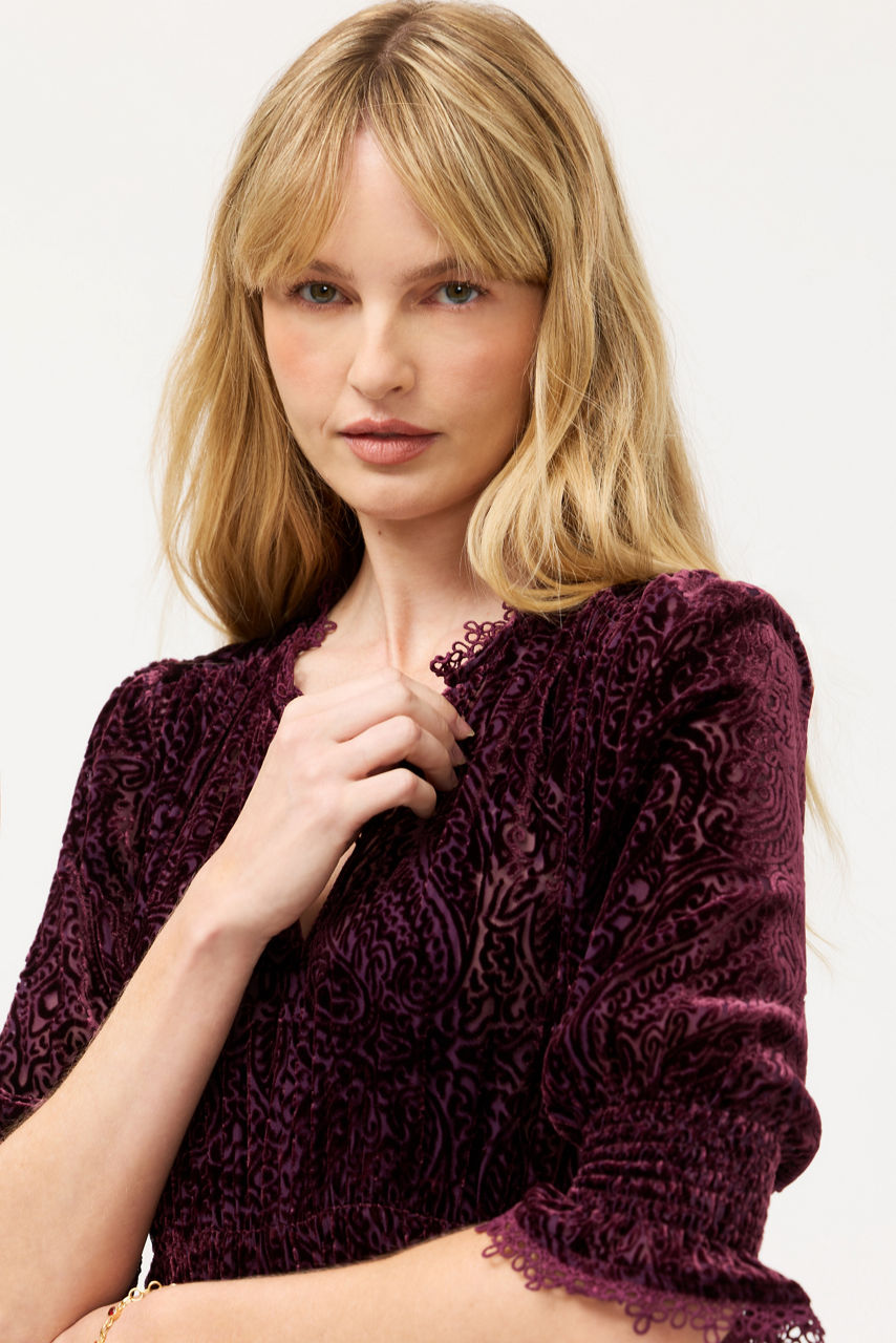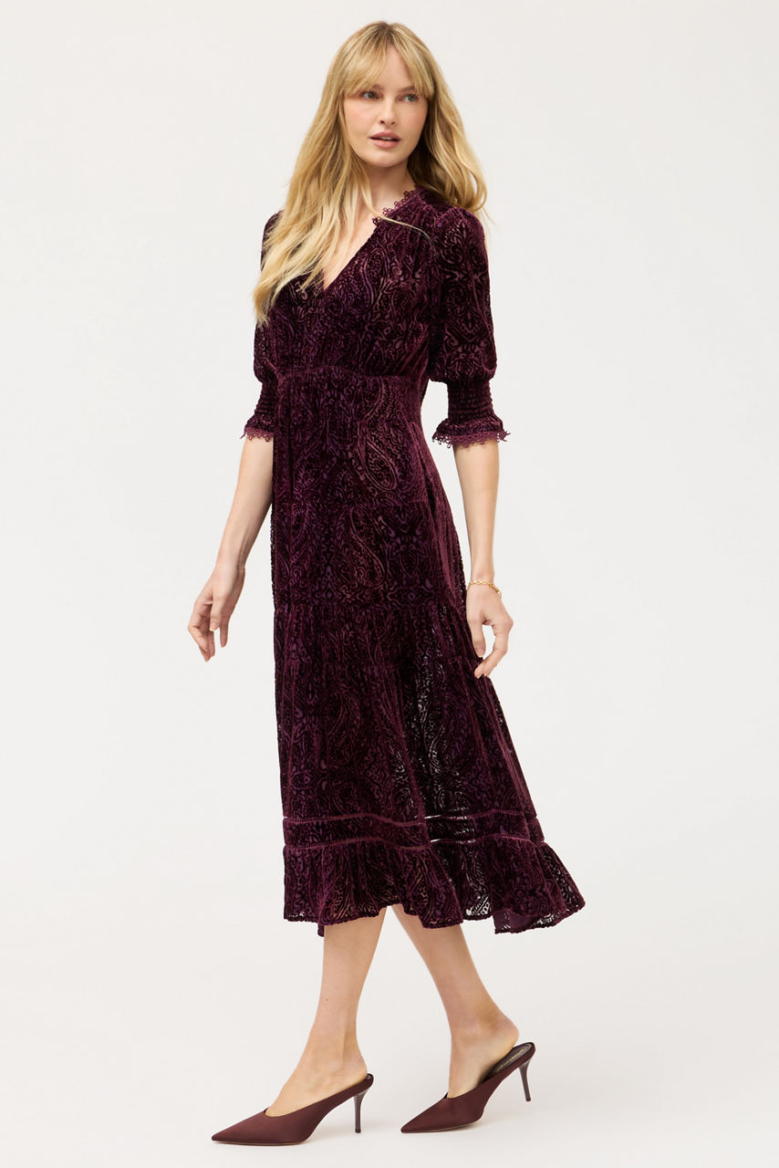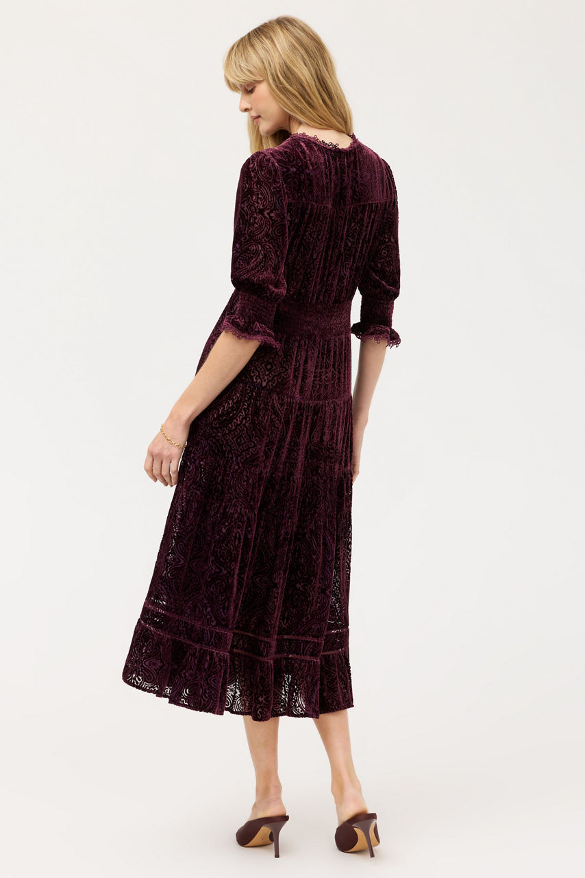 Crafted from a unique silk blend, the Daphne Tea Length Dress is embellished with a rich paisley burnout pattern. Featuring a split V-neckline and shirred puff sleeves with lace trim, this slip-lined dress is finished with a tiered skirt and a rail trim. Pair with classic pumps and a coordinating bag for a fresh evening look perfect for a night out.