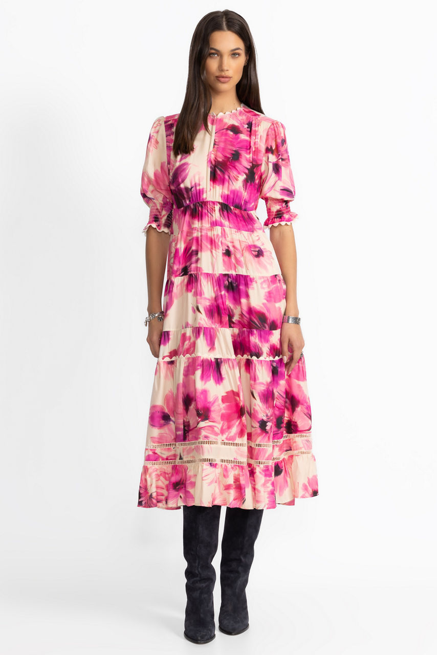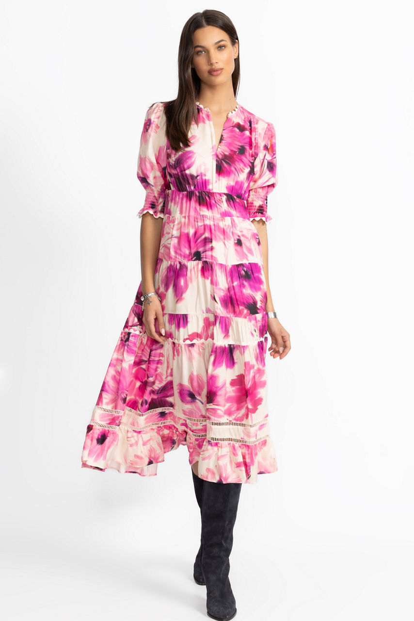 Crafted from a unique silk blend, the Daphne Tea Length Dress is adorned with brilliant floral blooms. Featuring a split V-neckline and smocked elastic back waist and sleeve cuffs, this stunning dress is finished with on-seam pockets and a beautifully embellished tiered skirt. Pair with strappy heels and delicate jewelry for an ethereal look.