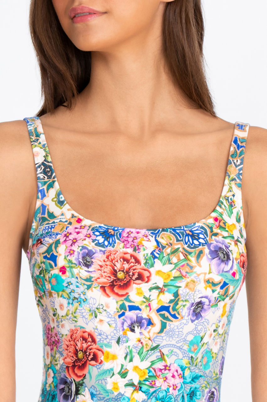 Like a great work of art, the Dawn Tank one-piece swimsuit draws looks of appreciation from all who behold it. The pattern resembles the dark background and light floral theme of our Phoenix line from the waist down. From the waist up, a pure white background hosts a riotous bouquet of brightly colored flowers a lei of flowers in the same pattern outline the scoop neck and straps.