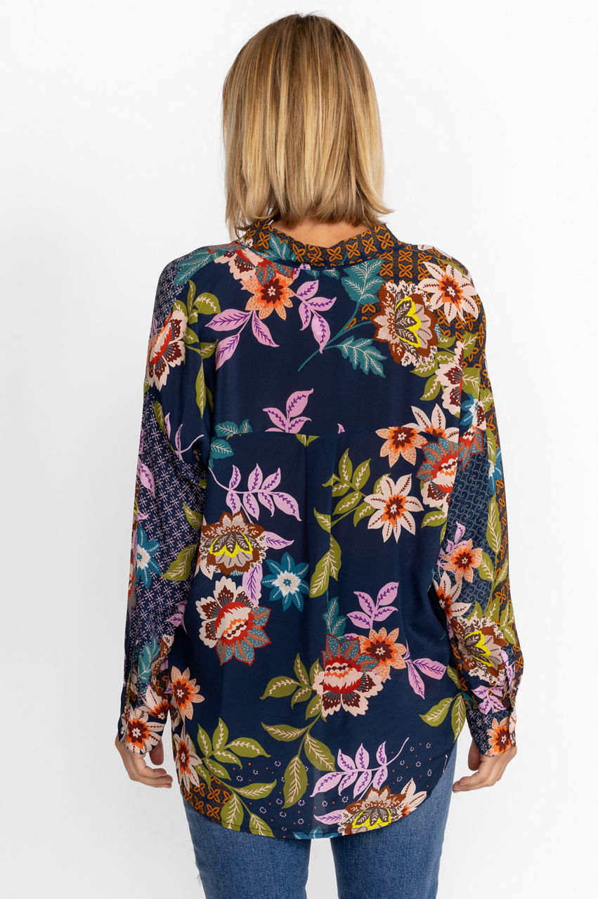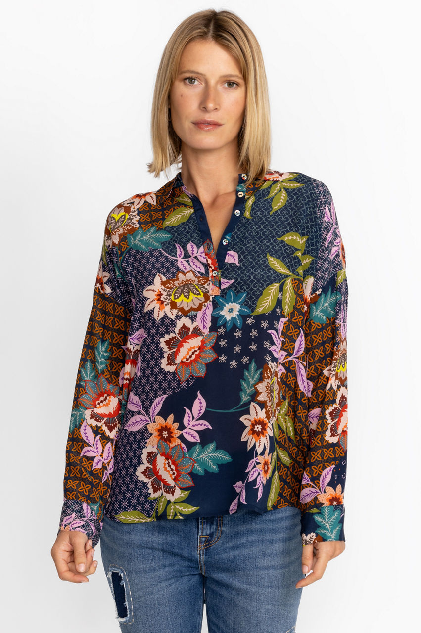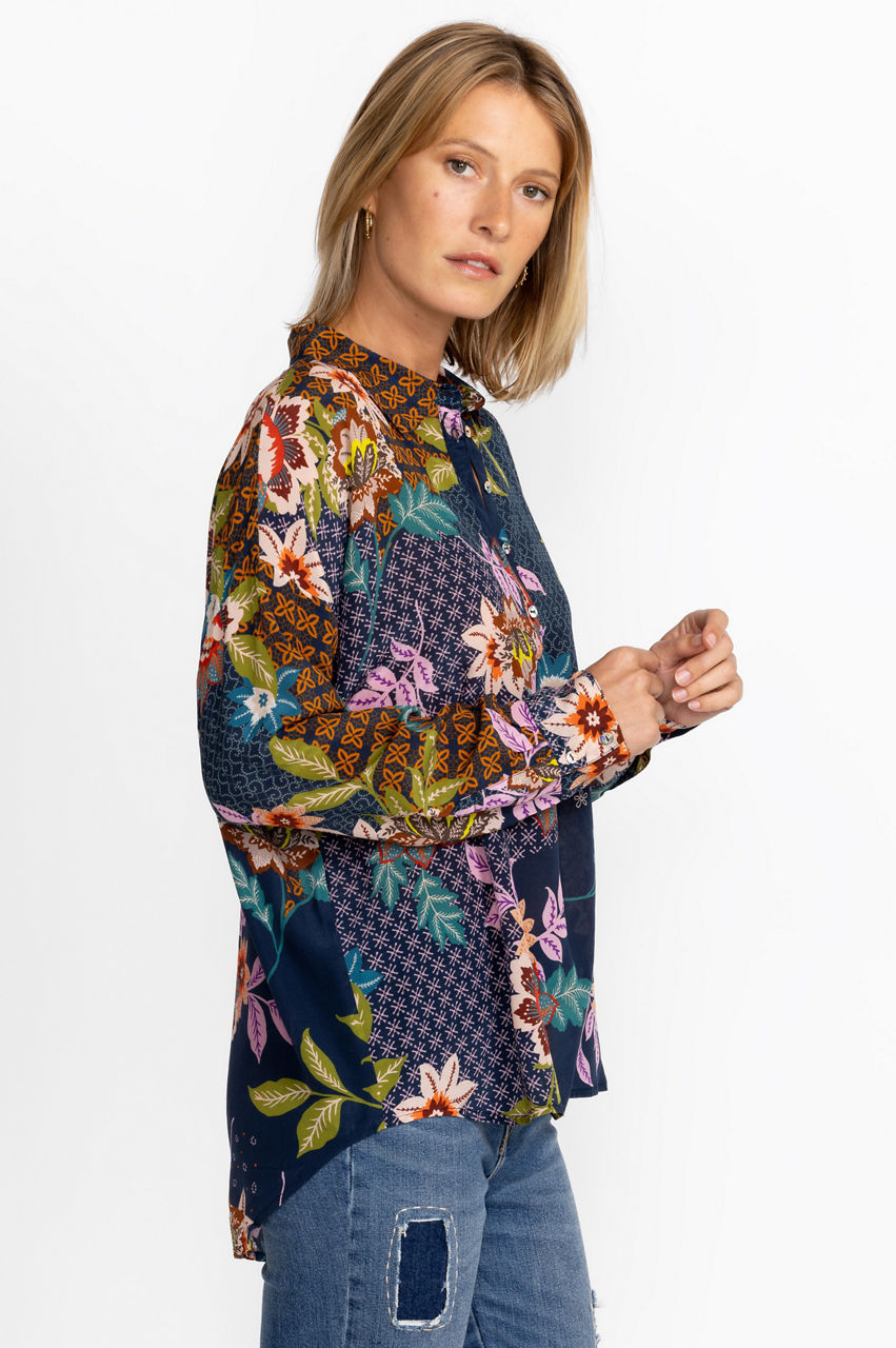 Designed from sumptuous silk, the Delfino Lotus Blouse is an exuberant take on a timeless wardrobe staple. The perfect pick for day-to-night transitions, this blouse boasts a front button fastening, long sleeves, a collar, and a medley of prints. Style this blouse with tailored pants and a low heel for a wear-anywhere evening look.