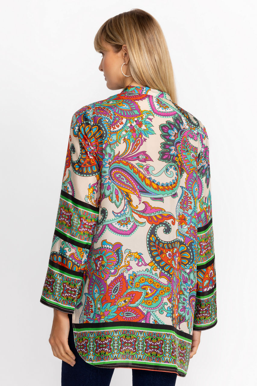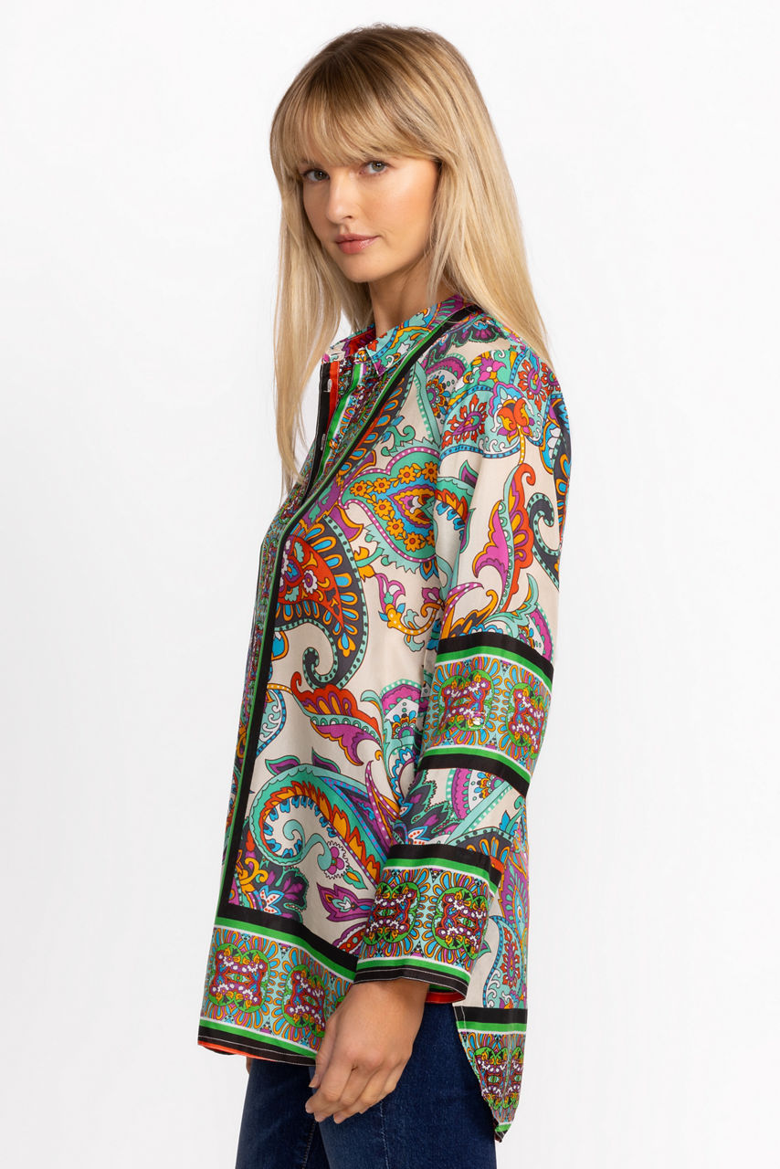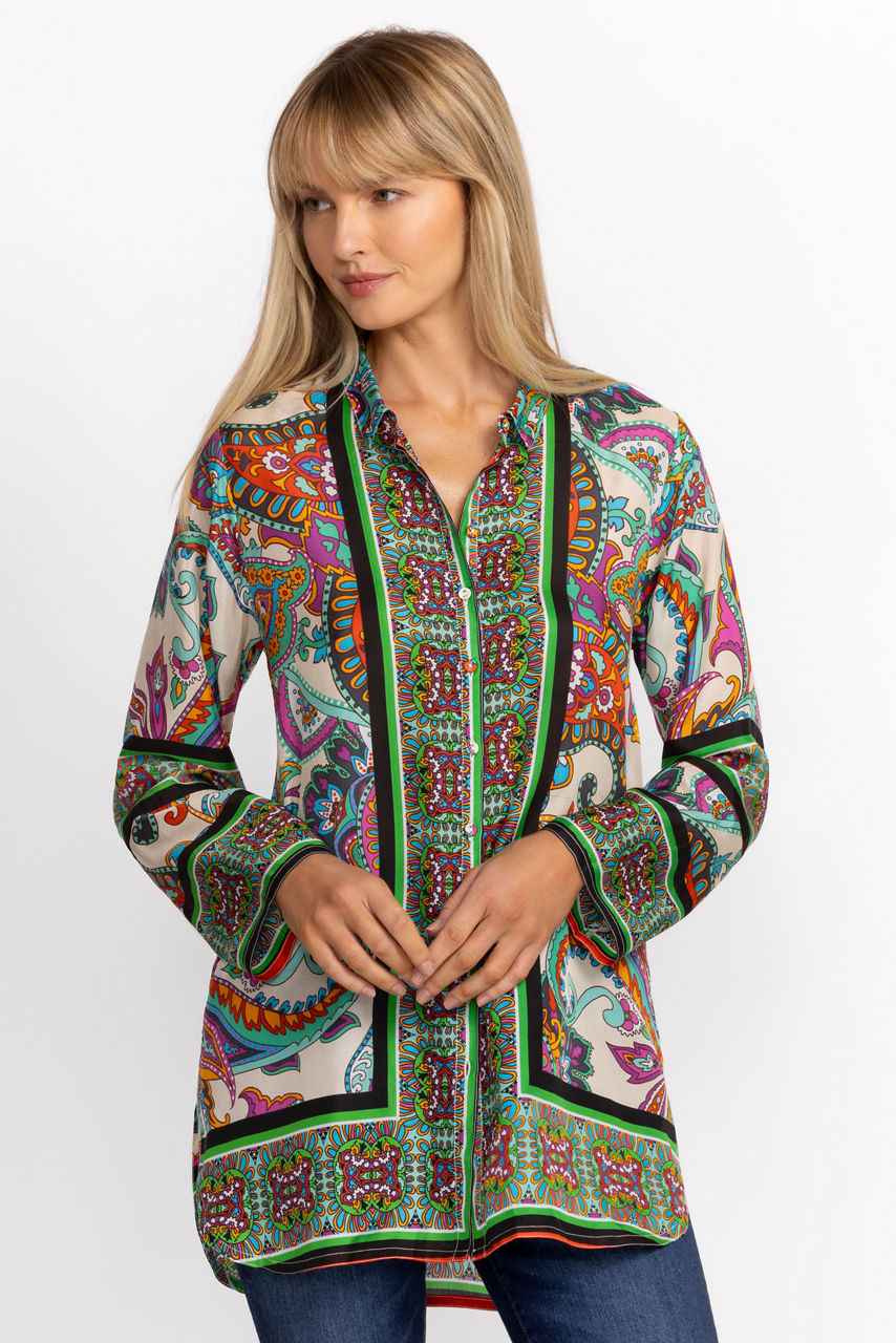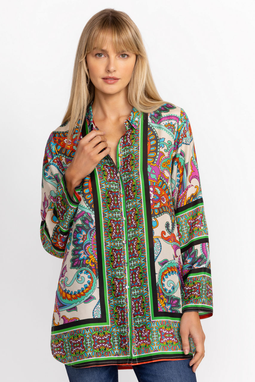 Crafted from 100% sumptuous silk, the Delia Tunic offers a brilliant combination of color and pattern. Featuring a traditional collared button-front and a beautifully ornate pattern with contrasting border designs is finished with roll-tab sleeves and a shirttail hem. Pair with classic black leggings and flats for a timeless casual look.