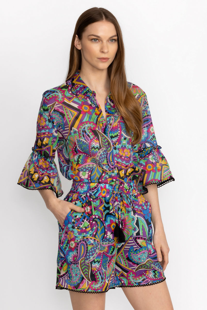 Crafted from 100% breathable cotton, the Demarne Pull-On Shorts with Trim are embellished with vivid color and pattern. Featuring an elastic waist with drawstring, these relaxed-fit shorts are finished with pockets and a delicate trim along the hemline. Pair with a black tee and sandals for a vibrant beachside look.