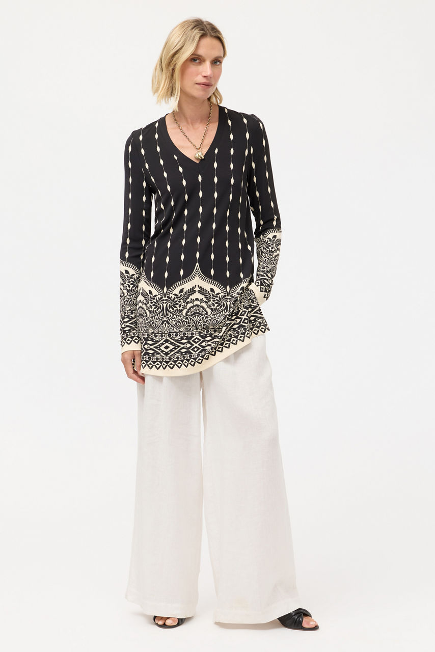 The Demi V-Neck Tunic is crafted from a lightweight flowing fabric with a hint of stretch. Designed with a V-neckline and long sleeves, this tunic features a bold contrasting pattern and is finished with slits at the sides for a relaxed fit. Pair with skinny jeans and classic flats for a timeless casual look.