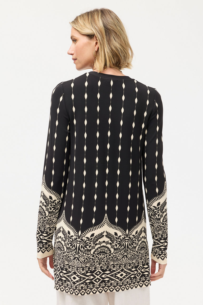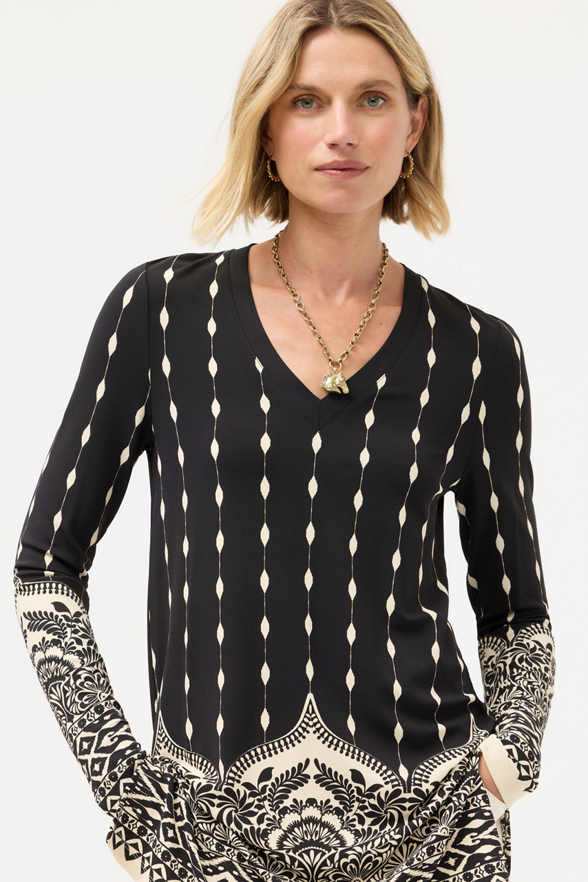 The Demi V-Neck Tunic is crafted from a lightweight flowing fabric with a hint of stretch. Designed with a V-neckline and long sleeves, this tunic features a bold contrasting pattern and is finished with slits at the sides for a relaxed fit. Pair with skinny jeans and classic flats for a timeless casual look.