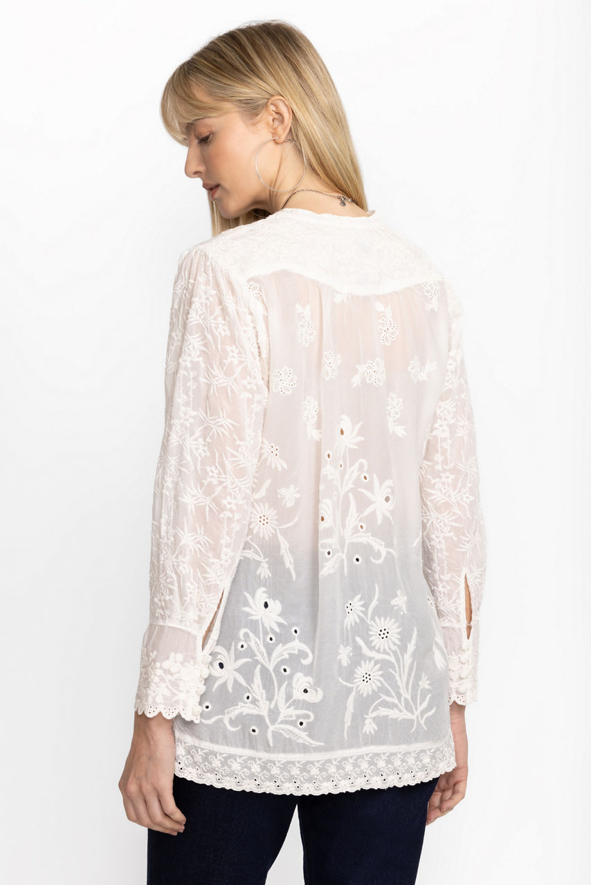 Thoughtfully crafted with style and comfort in mind, the Deni Isabel Blouse is exceptionally detailed. Featuring a button front and scalloped trimmed cuffs, this light and airy blouse is finished with intricate embroidery for a polished custom look. Pair with linen pants and leather sandals for a breezy resort look.
