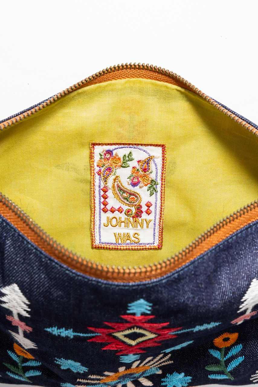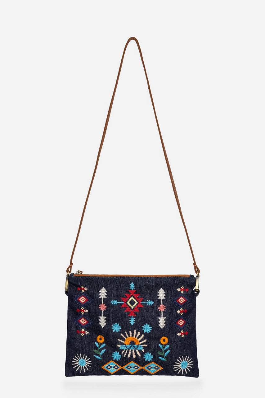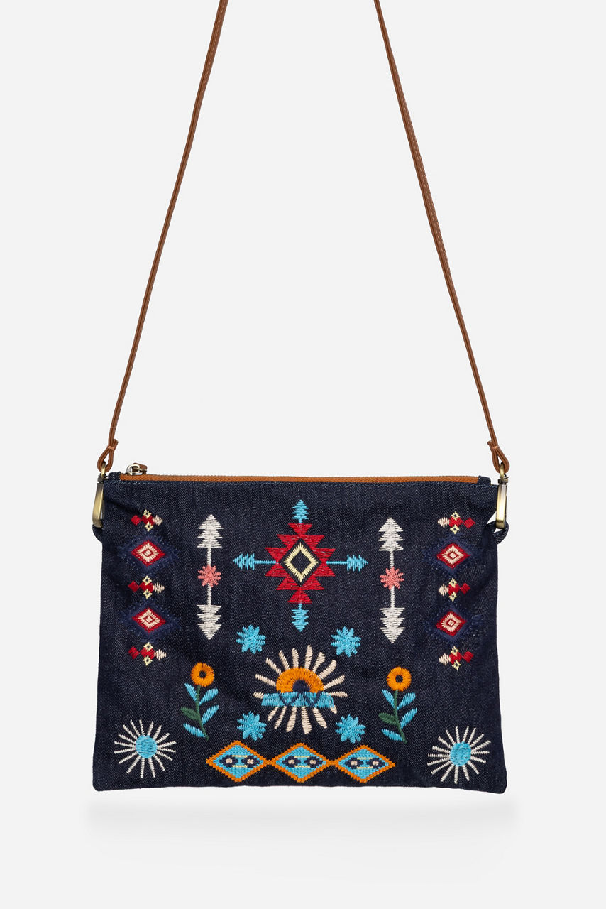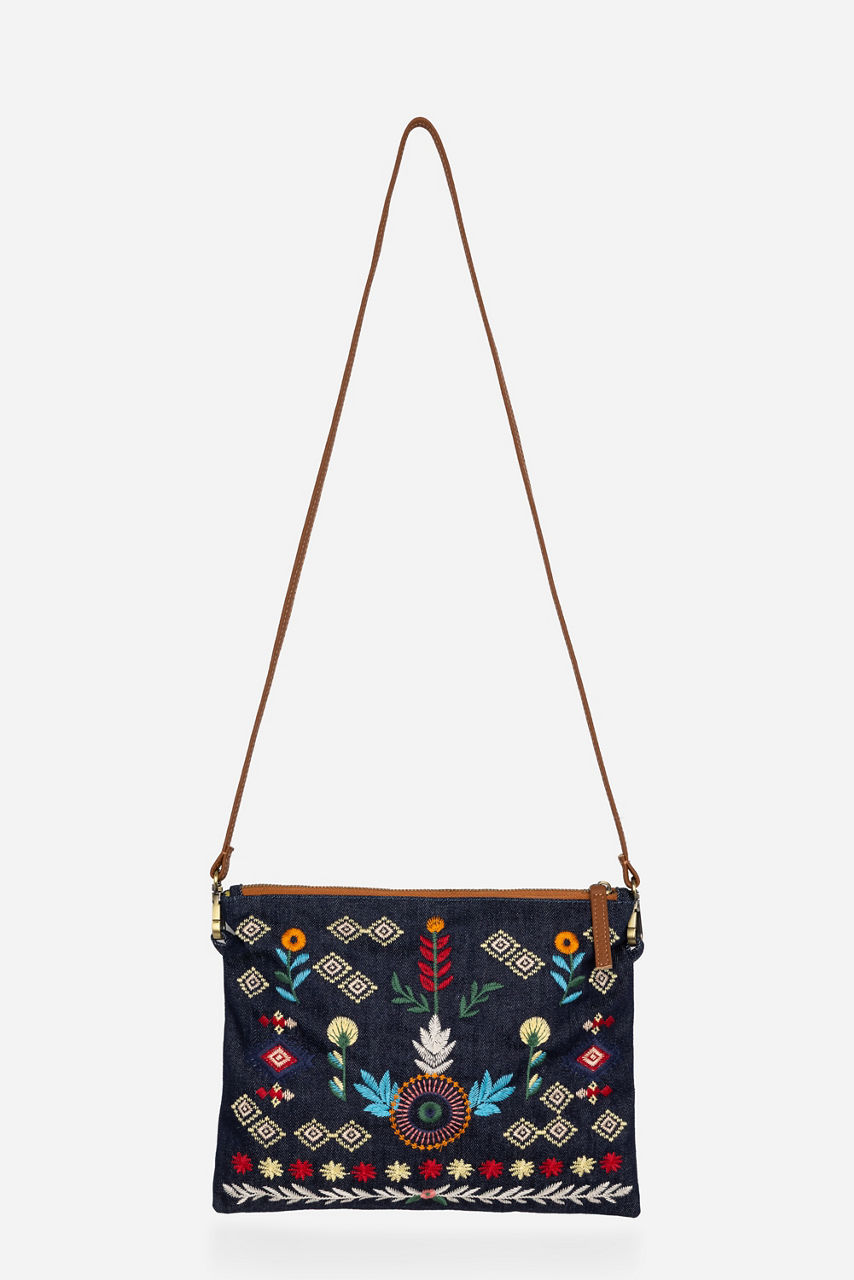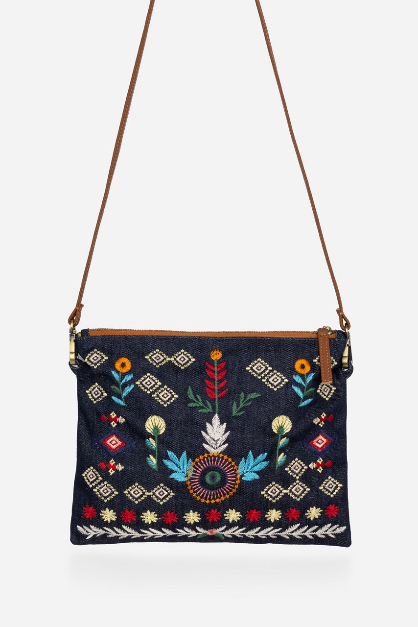 Crafted from 100% Cotton denim, the Denim Crossbody Bag is embellished with colorful floral embroidery. Designed with a top zip closure and a thin shoulder strap, this lightweight bag is perfect for daily use. Pair with a casual jumpsuit and fashion sneakers for a day of errands.
