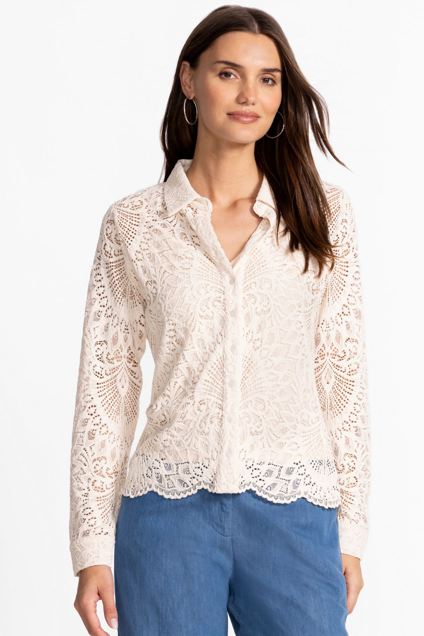 The Devin Button Down Shirt offers a distinctly feminine take on classic shirting. Crafted from a lightweight fabric, this collared button-front shirt features a lace shell with a delicate scalloped hemline paired with a cami for additional coverage. Pair with fitted pants and coordinating flats for a polished evening look.