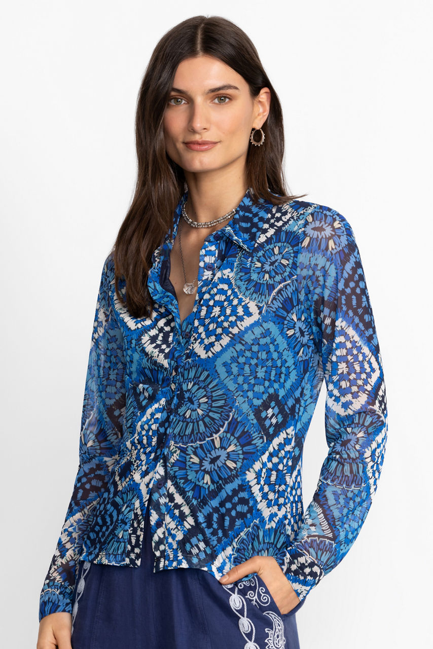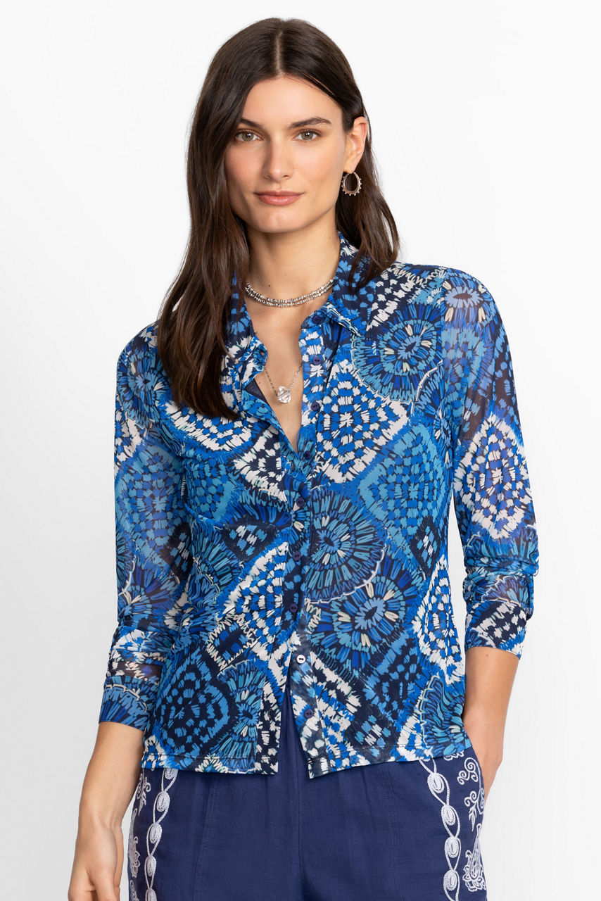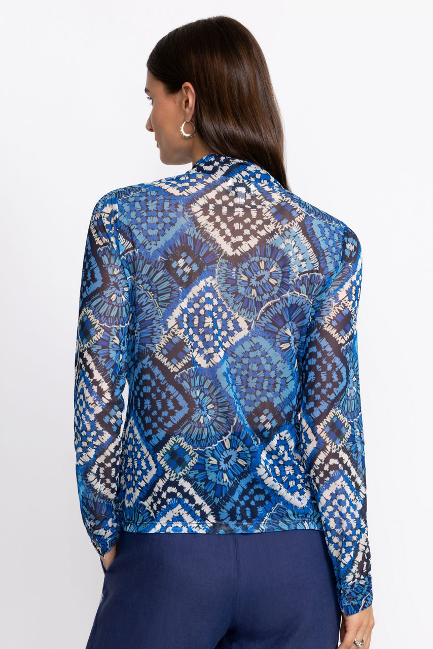 Adorned with a vibrant geometric pattern in hues of blue, the Devin Mesh Button Down Shirt offers a fresh take on classic shirting. Featuring a traditional collared button-front, this shirt is crafted from a unique mesh shell and finished with an interior lining. Pair with sleek navy trousers and coordinating blazer for a modern office look.