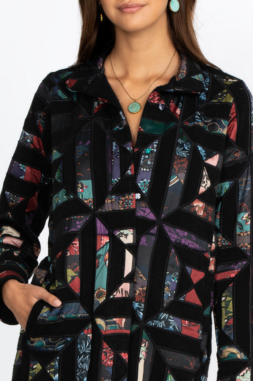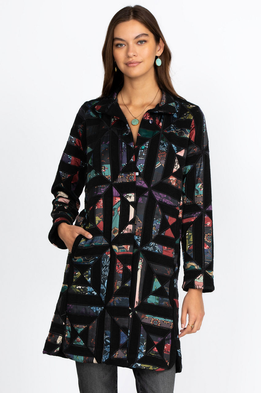 Cozy up in our colorful geometric-inspired Diamante Applique Coat, with its a standup collar and long silhouette that slightly flares out for a flattering look. Great for the weekend or work on those breezy autumn days, this coat pairs well with your favorite slim pants or leggings and sleek black boots.
