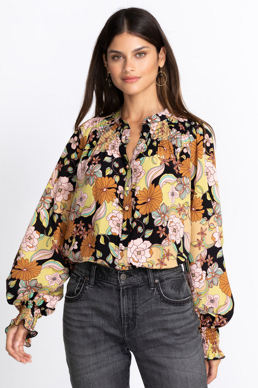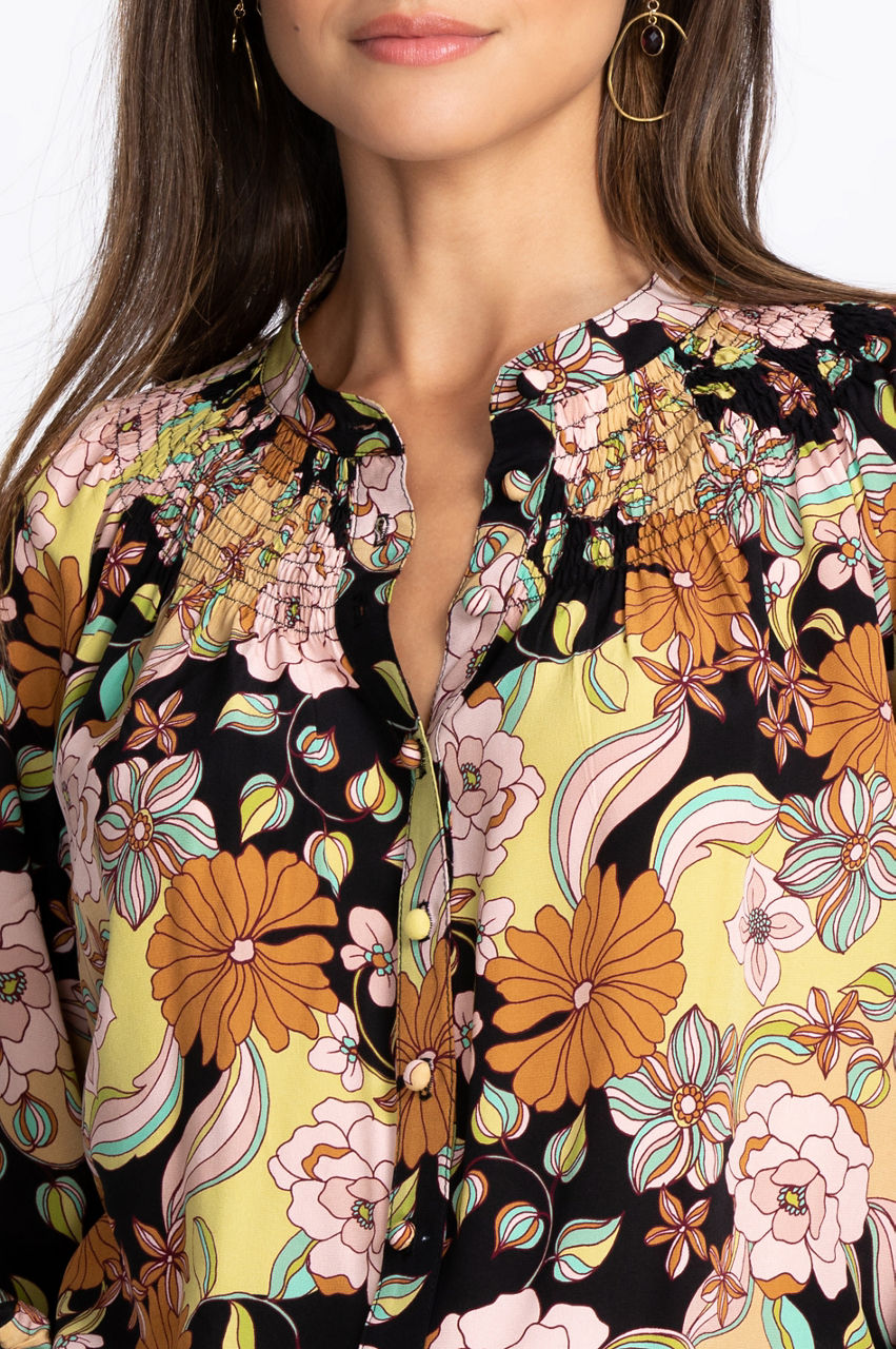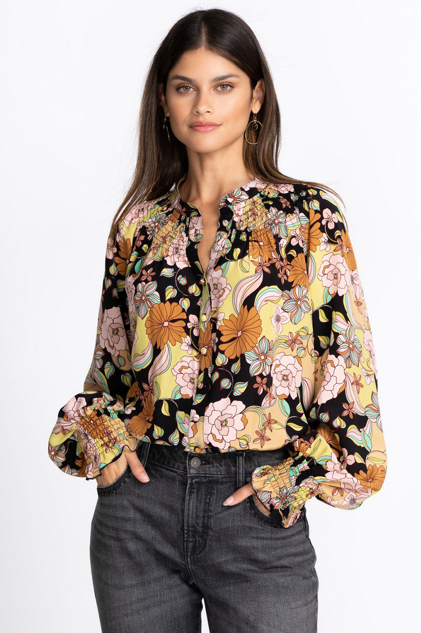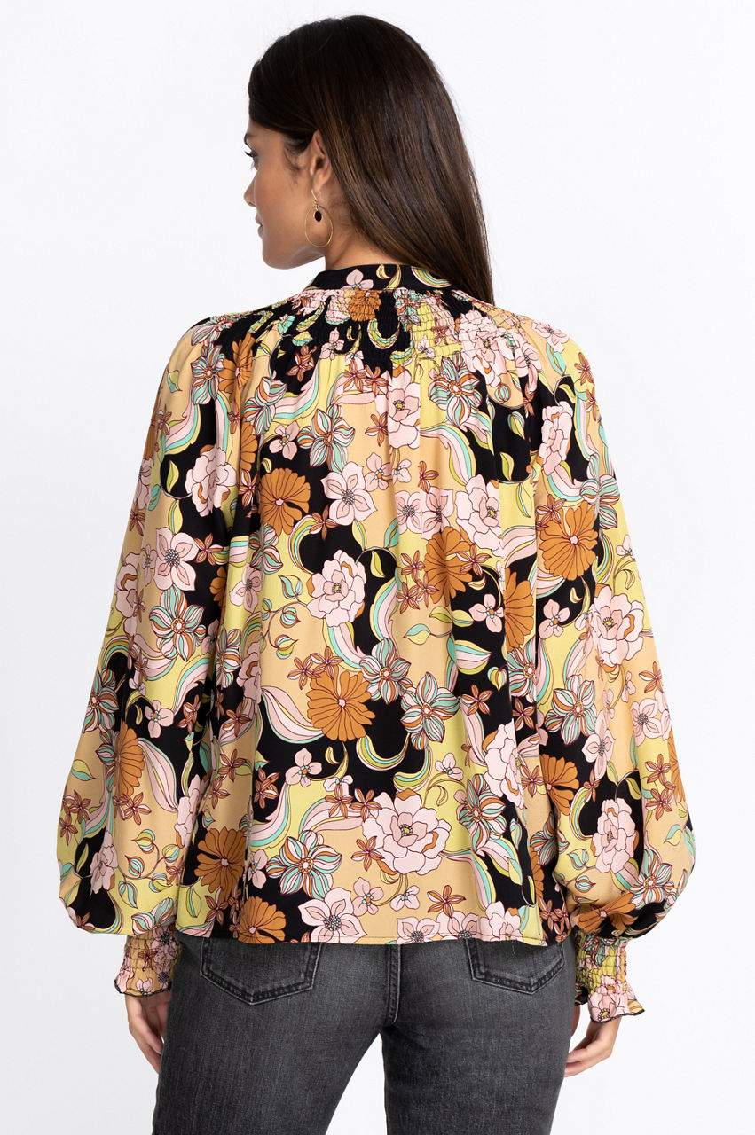 Express your style in our modern and functional DIANA BLOUSE. This timeless piece has a draped fit with shirring at the neck, cuffs, and a round high neckline. Its floral print and voluminous sleeves are perfect for summer, allowing you to feel the breeze. Its button details and tone-on-tone stitching make it a perfect combination with denim and flat sandals.