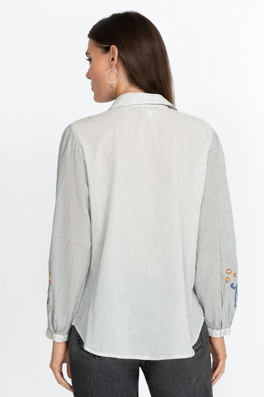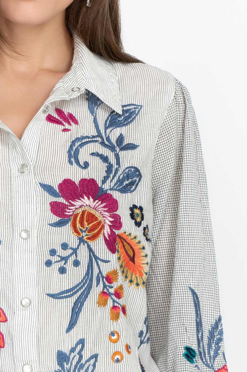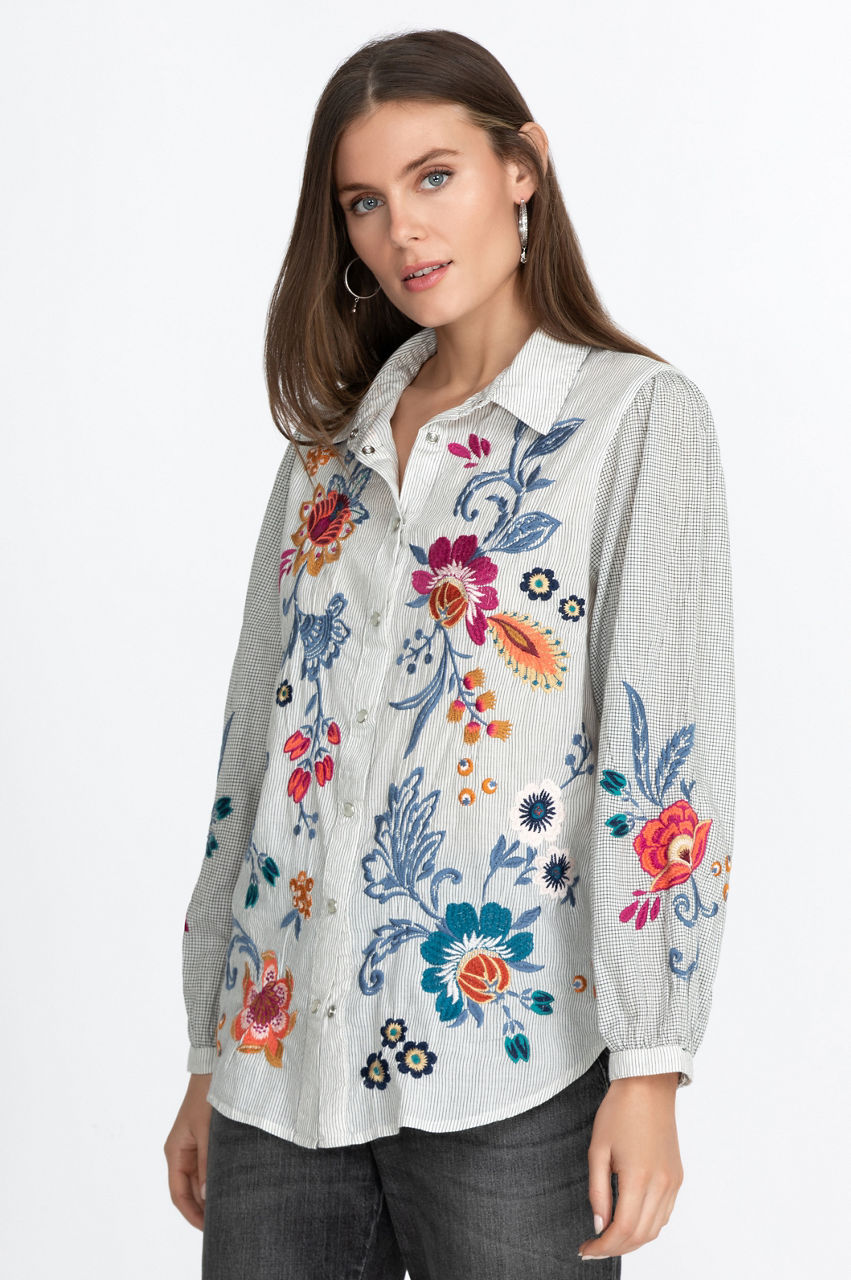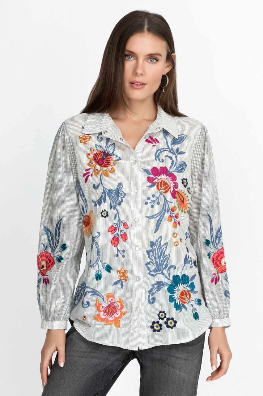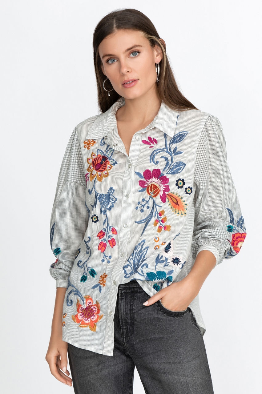 This button-down shirt features a classic collar, stylish bishop sleeves, and colorful floral details that will elevate any outfit. It' s a versatile top that will look great in casual or professional settings thanks to its flattering fit and classic construction. Pair this stylish top with some khakis or try layering it with a cotton tank top to play with prints and colors.