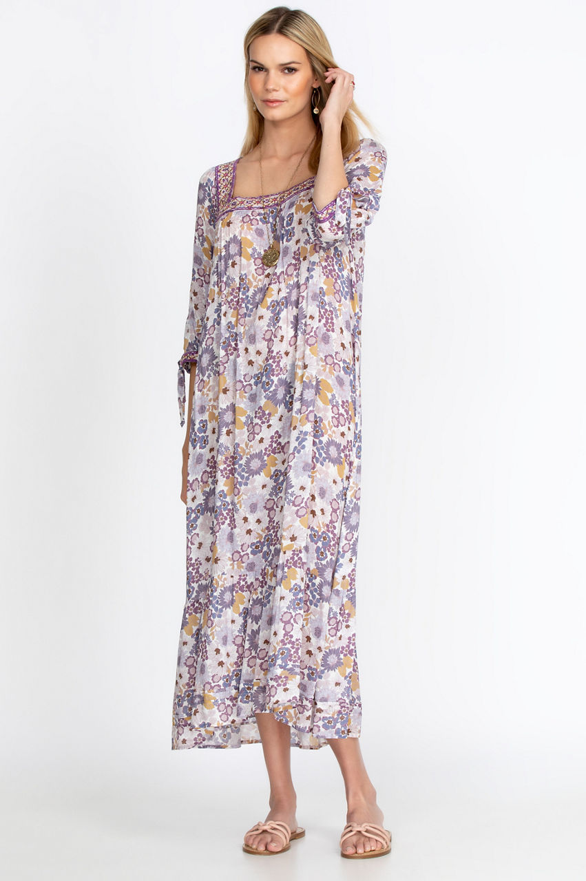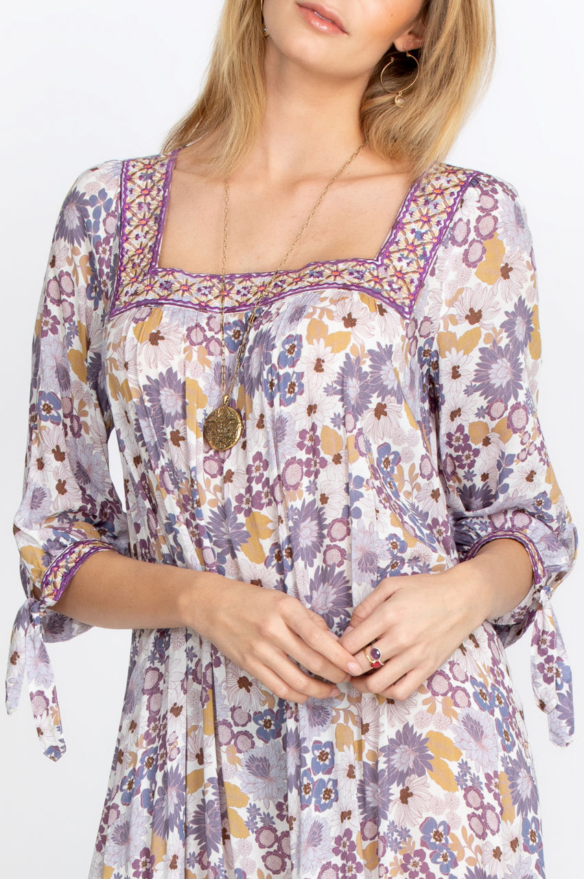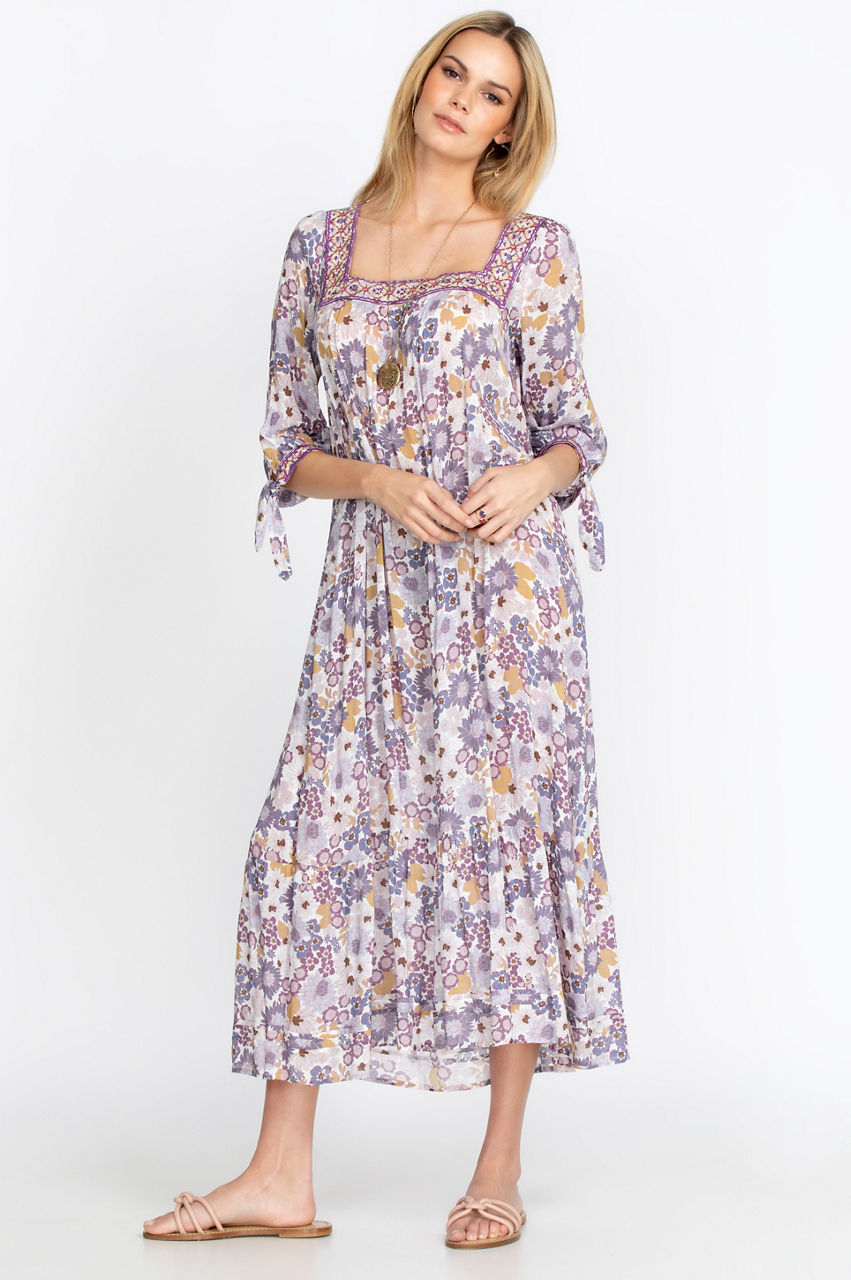 The Dione Midi Dress is a resolutely vintage piece with its Chintz-inspired print and tie knot details on the sleeves. The square neck will create a flattering silhouette, while the A-line cut will add movement to your outfit. It s a versatile dress that you can pair with some white sneakers for a laidback summertime look or turn into a staple of your fall wardrobe with some knee-high boots.