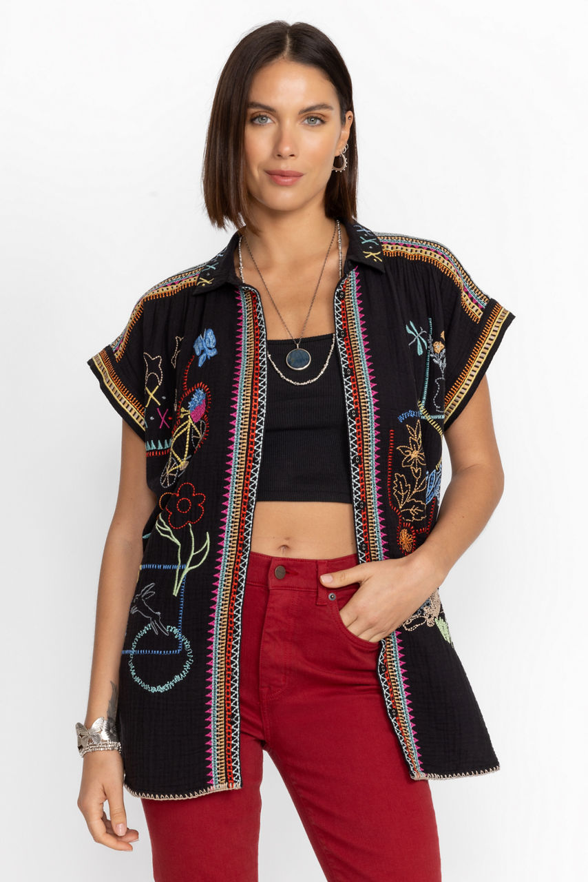 Crafted from 100% cotton, the Dionne Button Down Blouse is bold choice for any occasion. Featuring dolman sleeves and fabric gatherings at the shoulders, this button down is adorned with embroidered bursts of floral accents. Pair with dark denim for a bold ensemble .