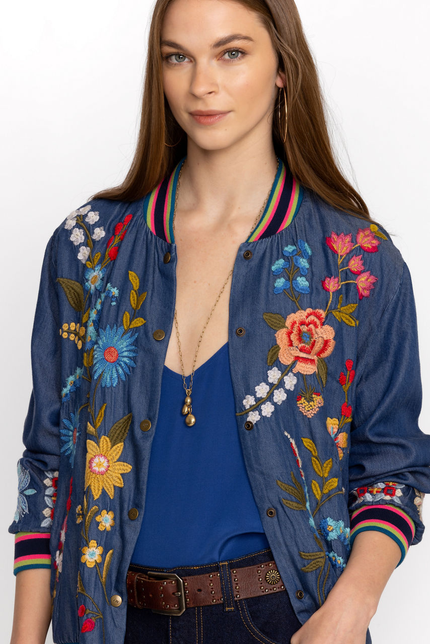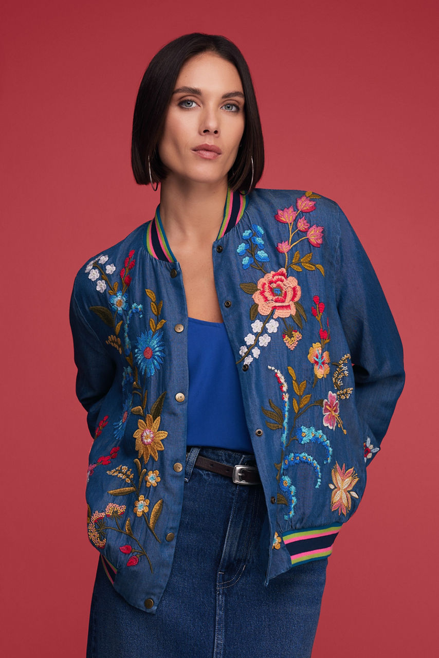 A fresh take on a classic silhouette, the Dionne Snap Front Bomber Jacket adds color and whimsy to your layering wardrobe. Crafted from a lightweight material and intricately detailed with colorful placement embroidery, this jacket is finished with bold stripes at the cuffs and hemline. Layer over a vibrant tee and pair with cargo joggers for a modern casual look.