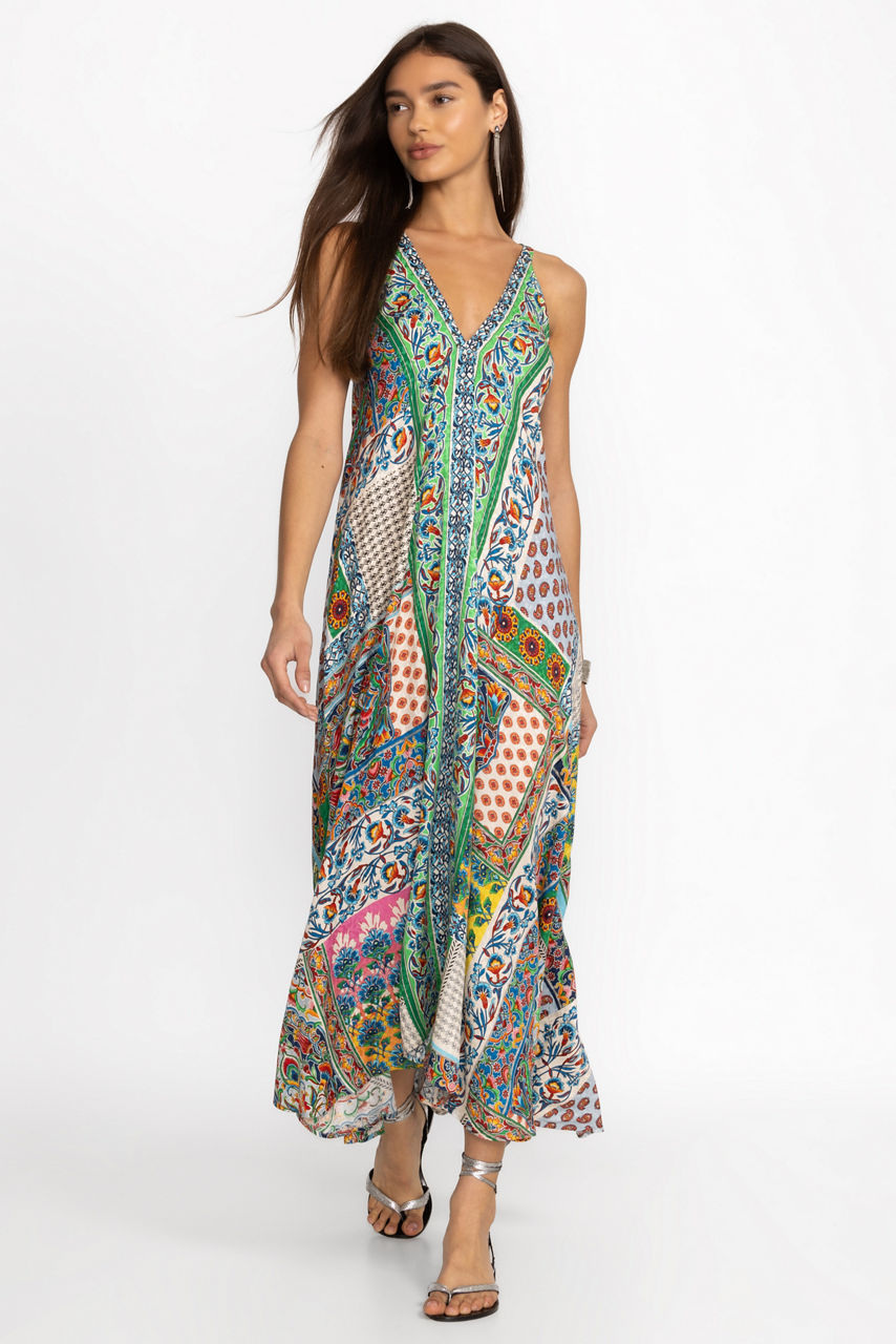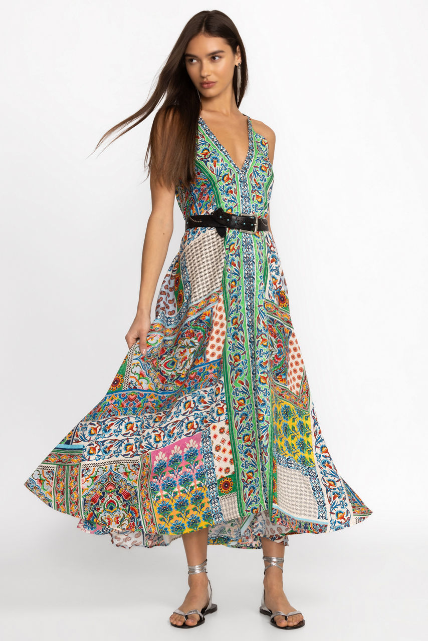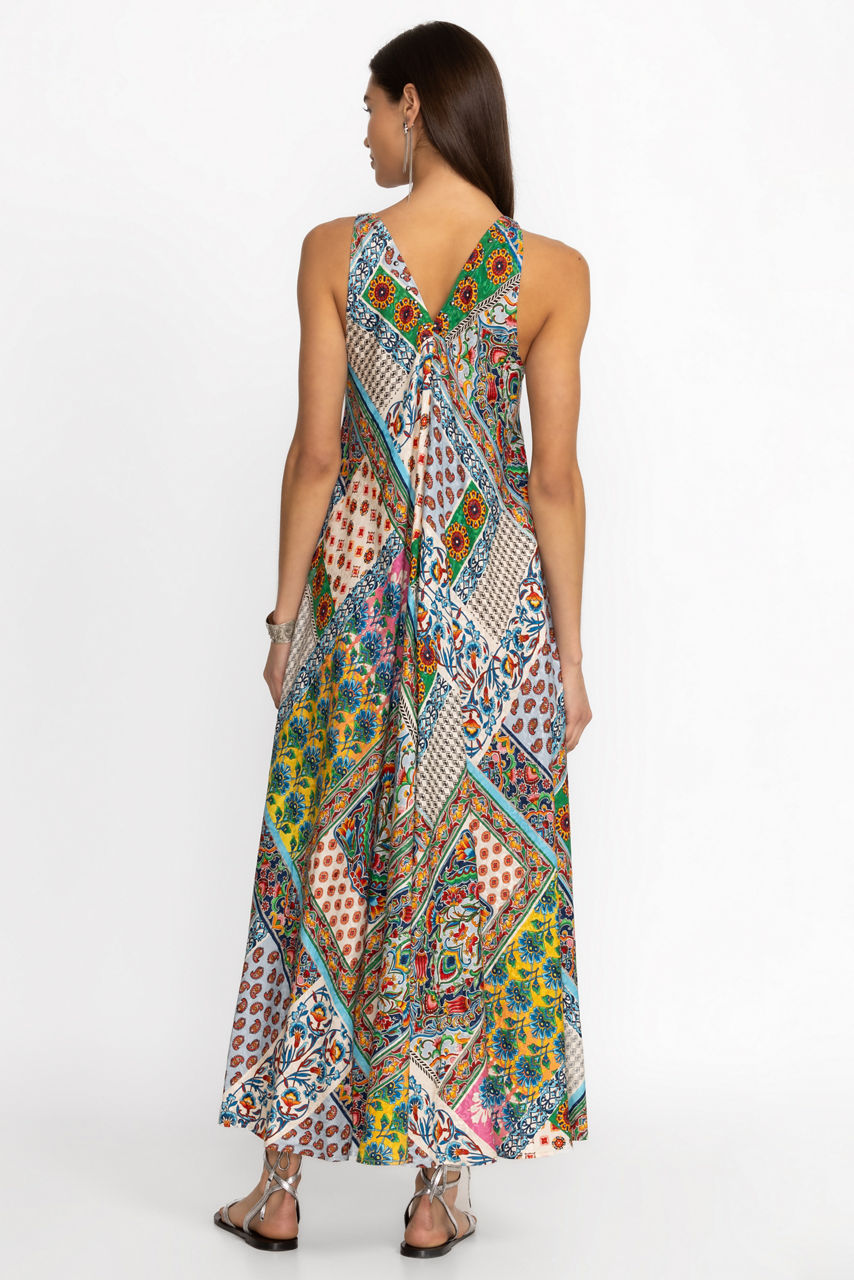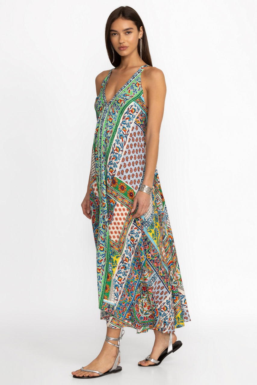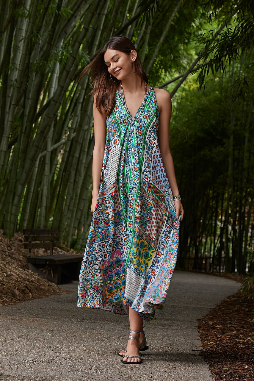 Crafted from a unique, breathable fabric blend, the Diskana Eva Dress is both elegant and comfortable. Featuring a deep V-neckline at both the front and back, this boho maxi dress offers a fitted waist and a breezy skirt that flows away from the body. Pair with leather sandals and delicate jewelry for a look that is perfect for dinner on the beach.