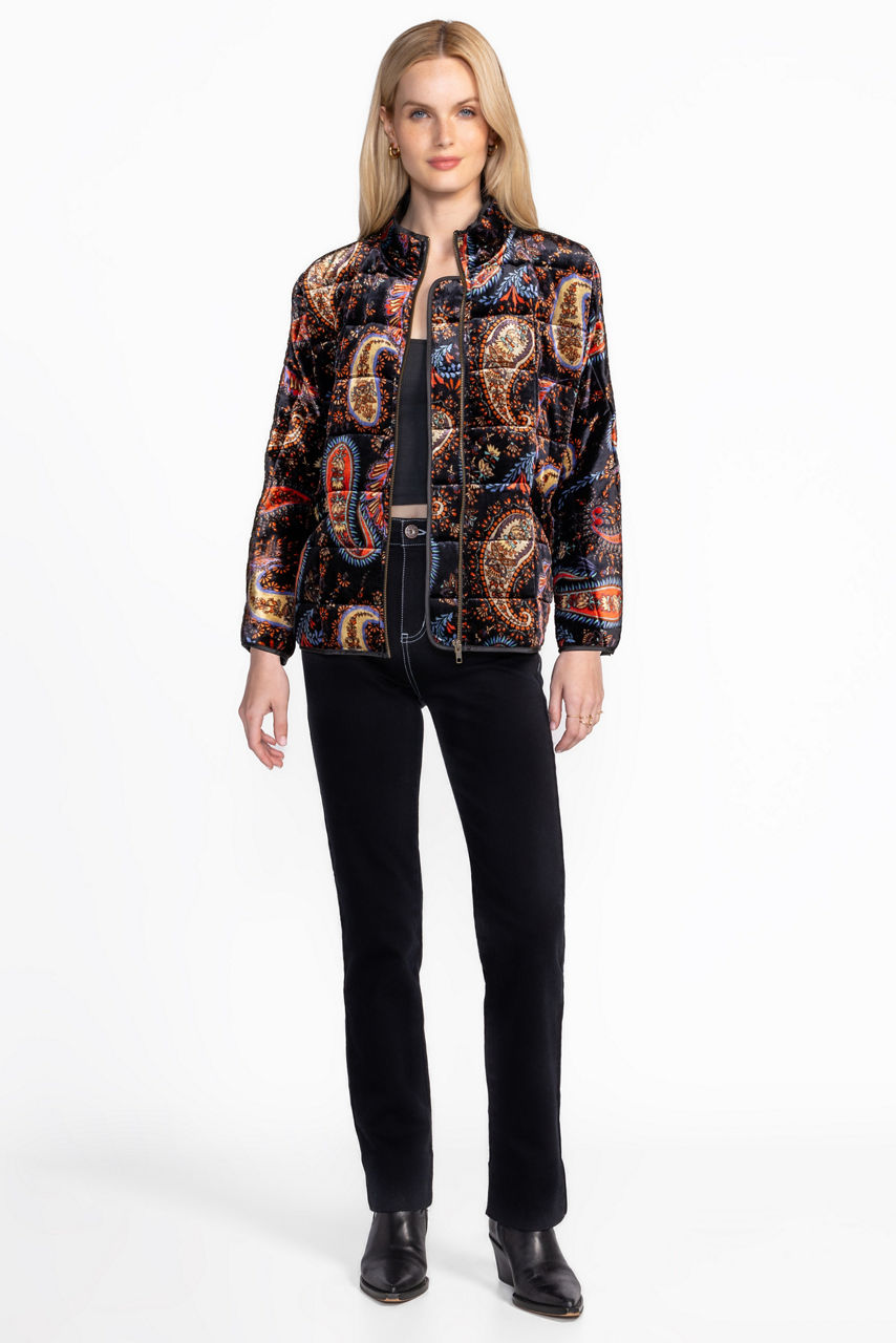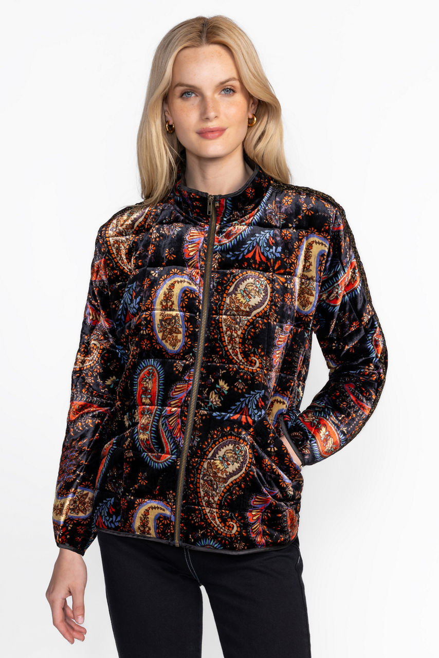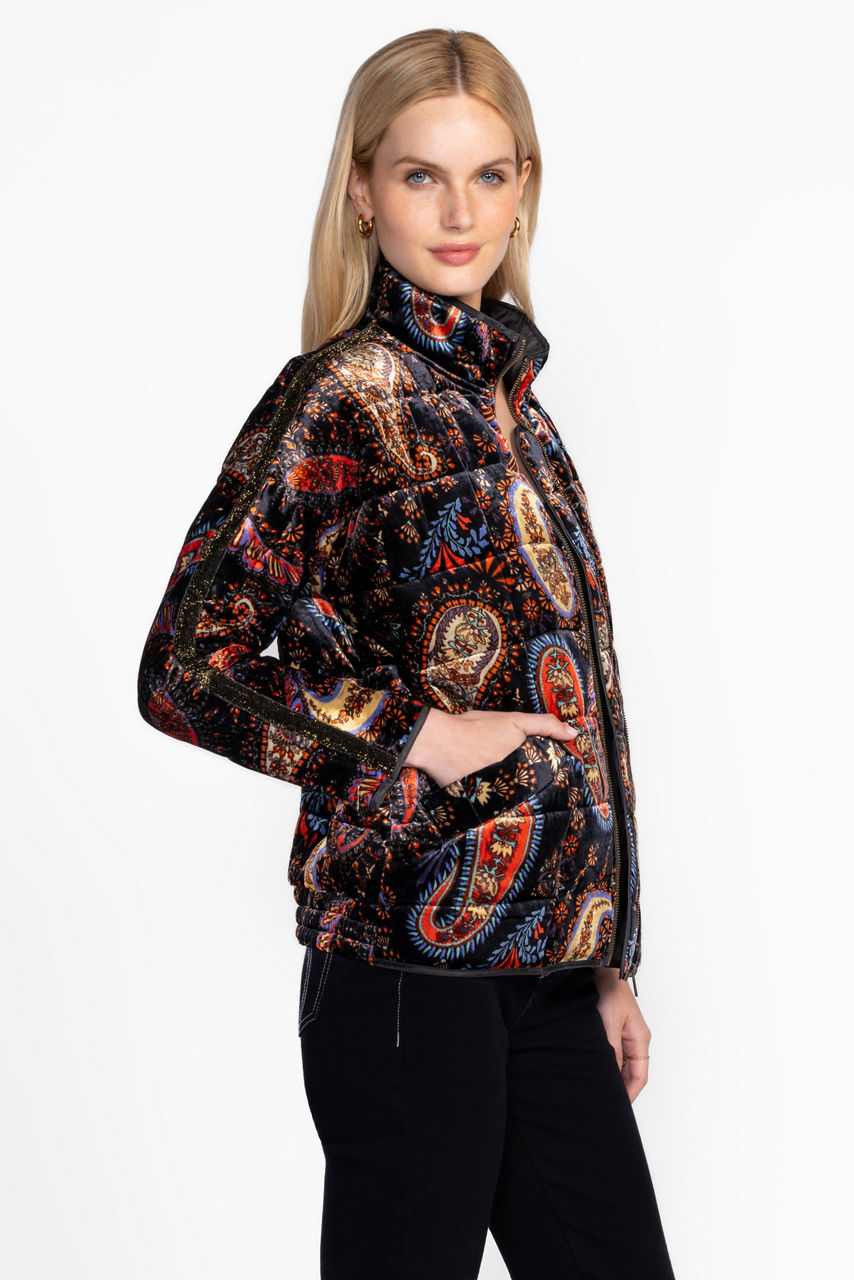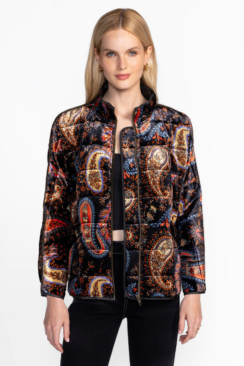 The Dolman Quilted Jacket offers a stunning cozy outer layer crafted from a unique silk blend. Featuring a standing collar and an easy zip front, this jacket is boldly embellished with a color-rich paisley pattern and is finished with convenient front pockets. Layer over a trendy pullover and relaxed-fit jeans for a modern casual style.