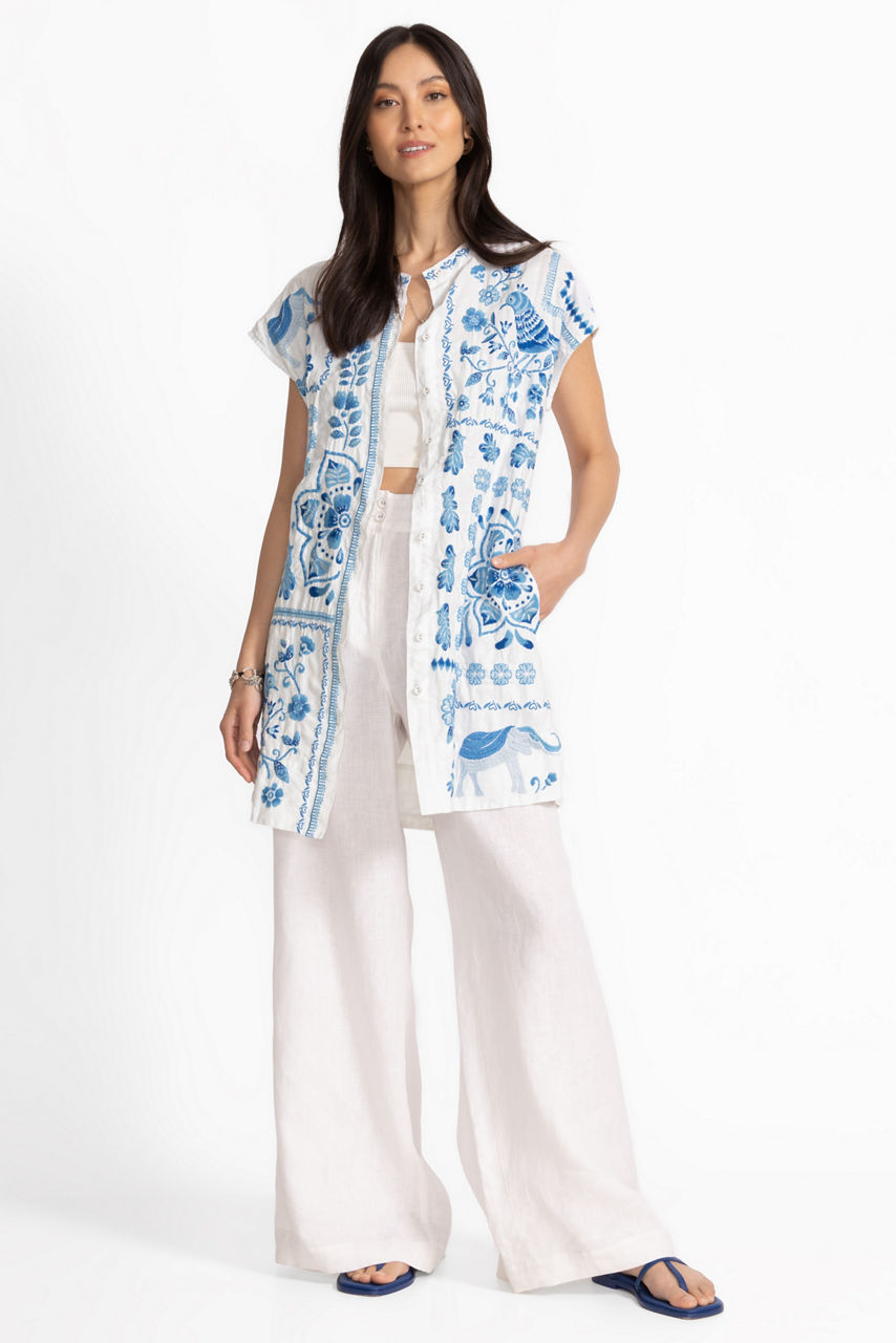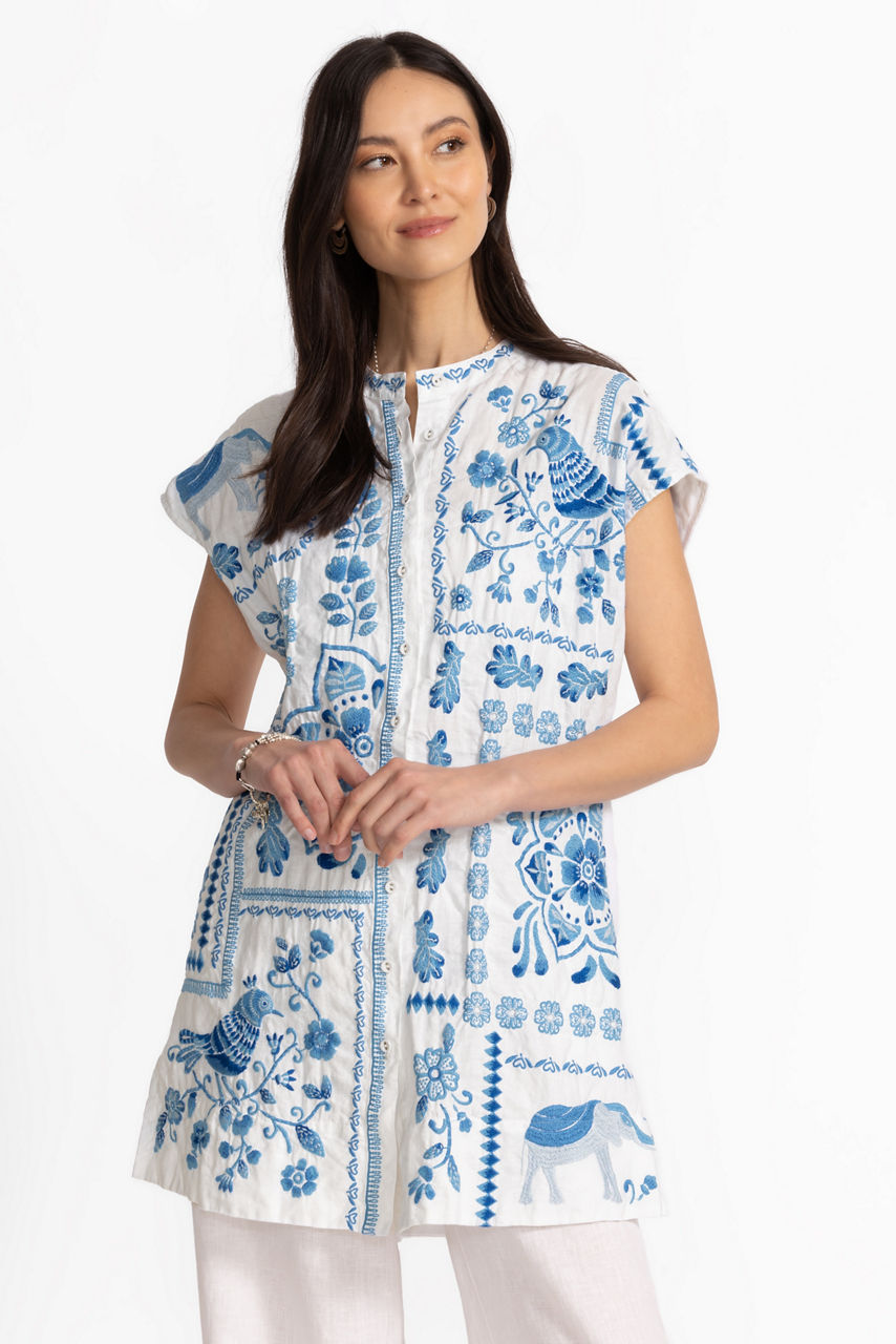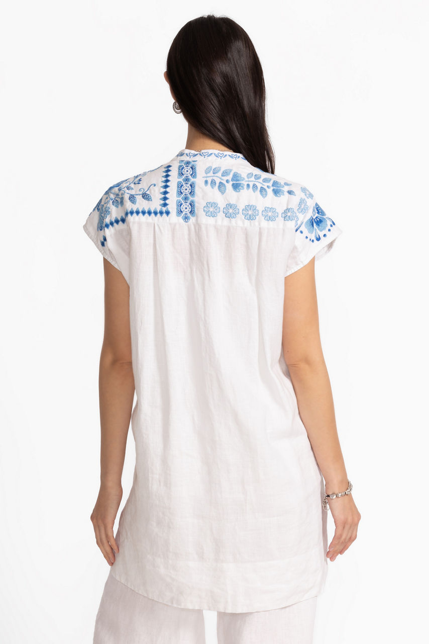 Crafted from 100% breathable linen, the Dolman Swing Tunic is ornately detailed with bandana inspired embroidered detailing. Featuring a banded collar and a classic button-front, this swing tunic is finished with generous pleating at the back and Dolman sleeves. Pair with coordinating leggings and smart flats for a polished casual look.