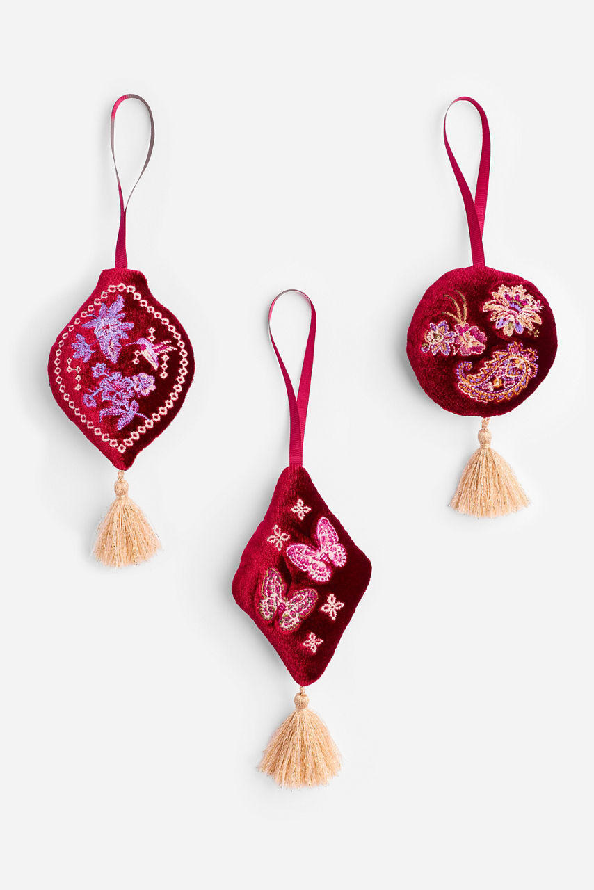 Beautifully embellished with colorful detail and intricate embroidery, the Domitila Ornament Set easily elevates the holiday experience. Crafted on a brilliant red backdrop enhanced with colorful flora and fauna, these unique ornaments feature a ribbon loop at the top and a decorative tassel at the bottom. Add to your holiday decor to elevate the look and feel of your home.