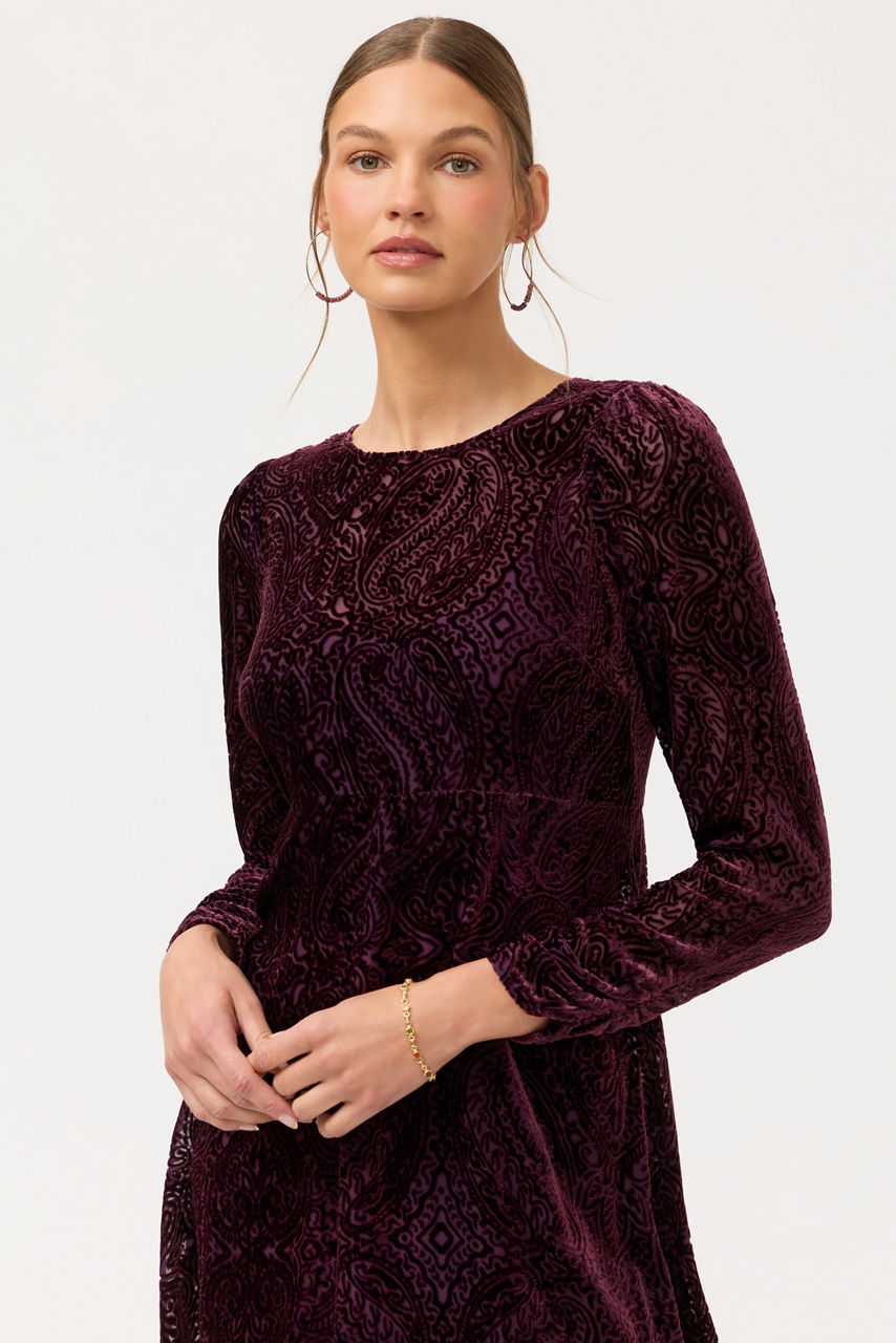 Beautifully crafted from a rich silk blend, the Donovan Dress is embellished with an intricate burnout paisley pattern. Featuring a crew neckline and a back zip closure, this slip-lined dress is finished with a classic fit-and-flare silhouette. Pair with classic heels and glittering gold jewelry for an evening event.