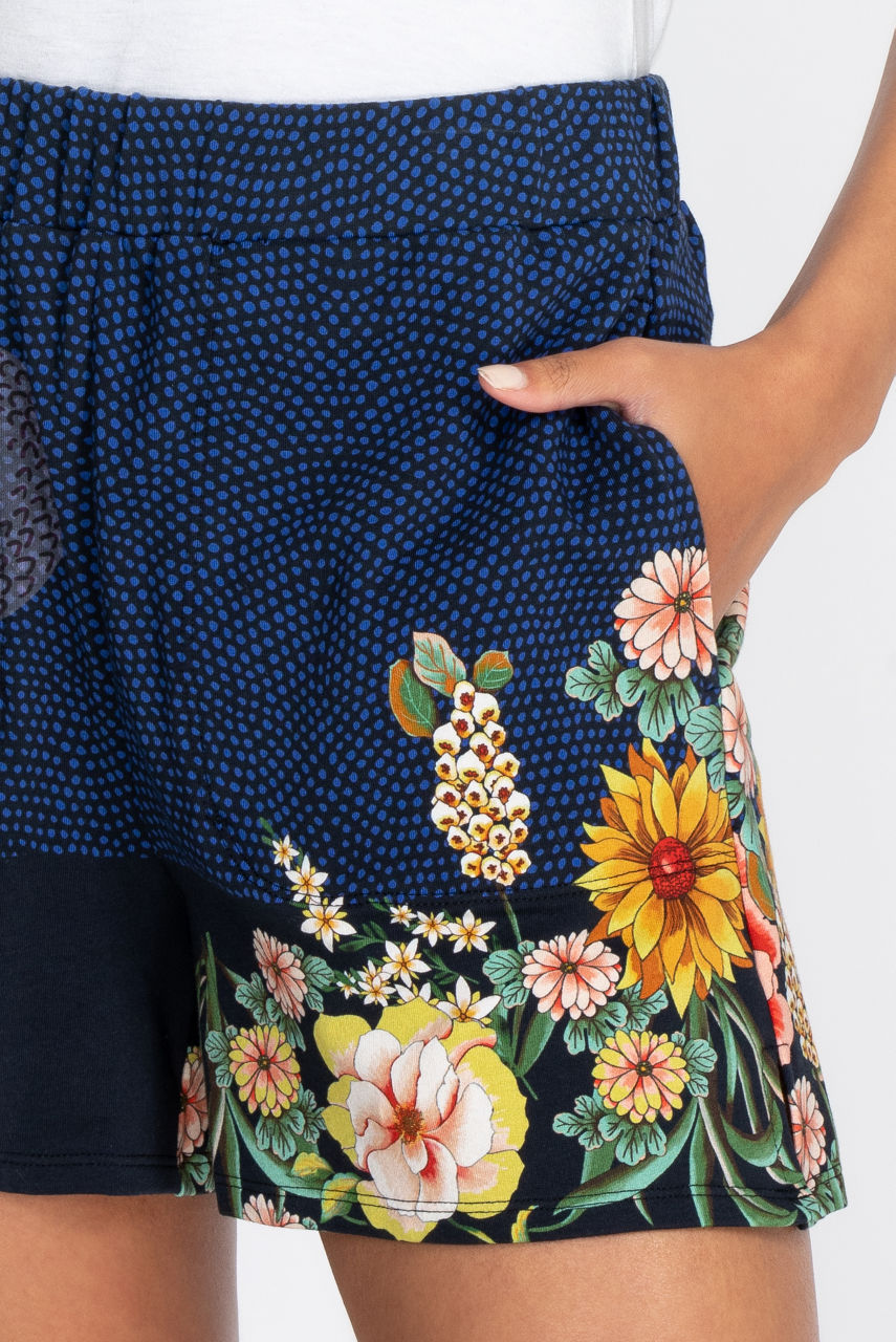 Add color and style to your summertime wardrobe with these comfortable cotton blend shorts. The elastic in the waist creates a relaxed fit while the asymmetrical floral motifs will add a stunning detail to your outfit. These shorts are an excellent option for complementing a simple crew neck tee or creating a contrast with a print blouse.