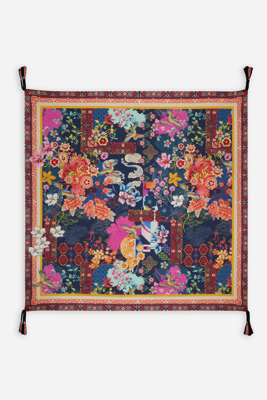 Embellished with an eye-catching floral print, the Dreamer Blu Silk Scarf adds beauty and elegance to any look. Crafted from 100% luxurious silk, this unique scarf is finished with a bold print and contrasting border and features tassels at each corner. Wear tied at the neck or on the handle of your favorite bag for a splash of color and enhanced texture.