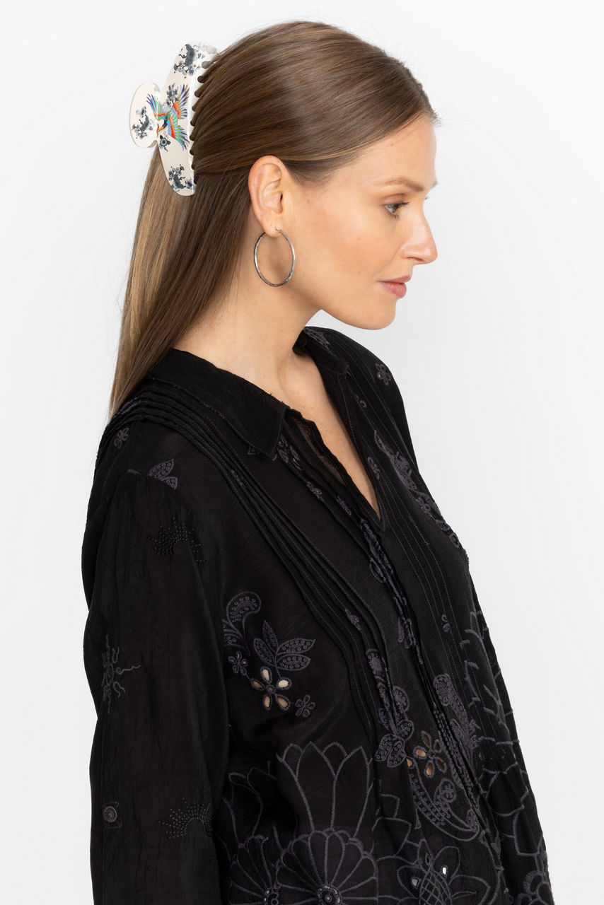 Offering a statement piece that combines sophistication with whimsical charm, the Dreamer Garden Hair Clip adds a splash of color to your overall look. Featuring a beautiful depiction of a tropical bird in flight, this sturdy clip is perfect for daily use. Add to your handbag for easy access at a moment's notice.